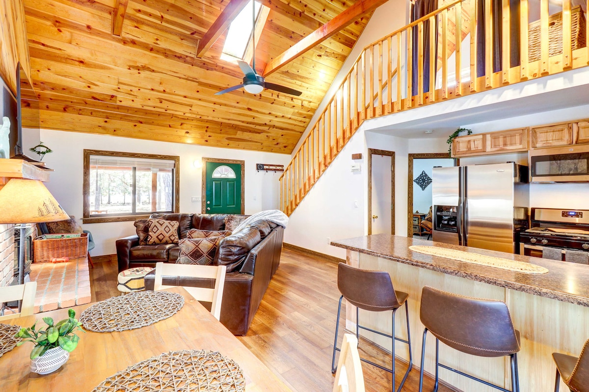 Entfliehe auf 2 Hektar ruhiges bewaldetes Land an der Rim Road. Diese entspannende Blockhütte am Pinetop-Lakeside grenzt an einen riesigen Wald, ist haustierfreundlich und hat einen großen eingezäunten Hinterhof. Die Ferienwohnung liegt 1,8 Meilen vom Woodland Lake Park entfernt, der eine Wanderschleife, Angeln, Radfahren, offene Felder, einen Spielplatz, einen Picknickplatz, Frisbee-Golf und vieles mehr bietet! Genieße diese wunderschön eingerichtete und voll möblierte Hütte mit Kamin, 2 Schlafzimmern und 2 Badezimmern, darunter ein großes offenes Loft-Zimmer und ein Schlafsofa.