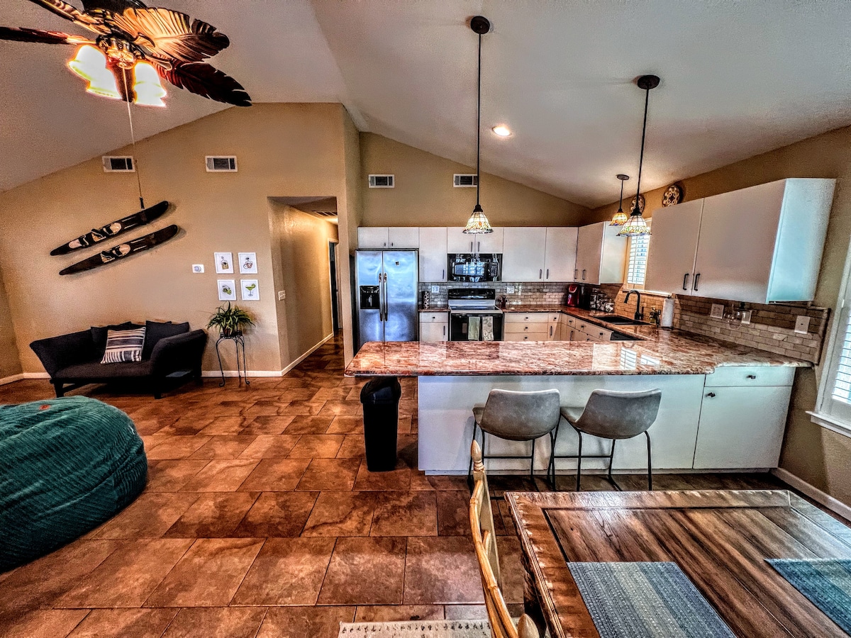 Entfliehe dem Alltag an den entspannenden See für Ruhe und Frieden! 2 Schlafzimmer, 2 Bäder + Loft bieten einen ruhigen Rückzugsort für 6 (max. 8). High-Speed-Internet für mobiles Arbeiten. Kostenlose Kajaks für die Seerundfahrt. Genieße Kaffee auf der Terrasse, genieße S'mores an der Feuerstelle oder entspanne dich am Dock. Bring deine Angelruten für zusätzliche Freude mit! Mindestaufenthalt 2 Nächte. Keine Haustiere. Haftungsausschluss für ein gutes Gefühl. Tauche ein in die Ruhe des Lebens am See, wo jeder Moment eine wertvolle Erinnerung ist, die darauf wartet, gemacht zu werden.