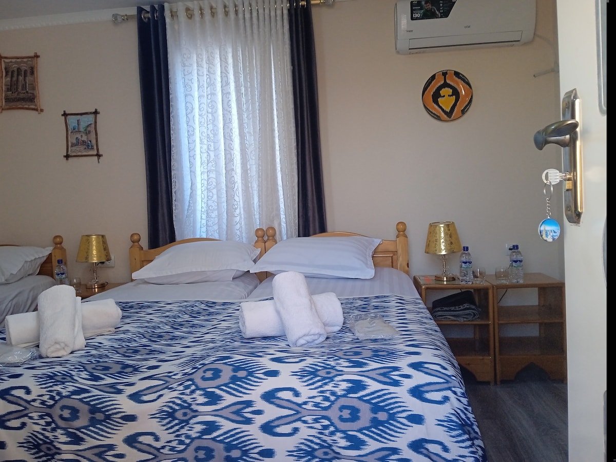 Ein gemütliches Privatzimmer für max. 4 Personen in einer zweiten Etage mit privater Dusche und 1 Doppelbett (neue orthopädische Matratze) und 2 Einzelbetten im Schlafzimmer. Separates Wohnzimmer mit Sofa. Nur wenige Gehminuten von allen historischen Stätten entfernt. Die Touristenregistrierung wird zur Verfügung gestellt. Kostenloses WLAN. Begrüßung des englisch- und russischsprachigen Gastgebers. Kostenloses und frisches Frühstück, das jeden Morgen serviert wird! Der Bahnhof kann für zusätzliche 40.000 uz/sum(~4 $) arrangiert werden. Ich kann dir beim Kauf von Zugtickets helfen, $ 3 pro Ticket. Bester Ort!