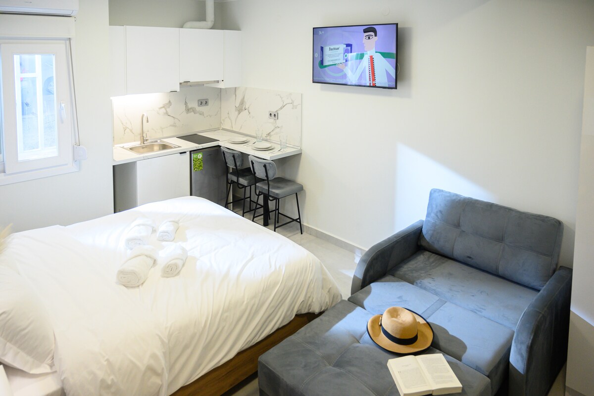 Enjoy your stay in this elegant and minimally decorated comfortable studio (36sq.m. net space +extra 20sq.m. space at the veranda), located in the beginning of Panorama, away from city's noise, yet very close to city center. Walking distance from: - Agios Loukas clinic (17min) - Anatolia College (15min) - ACT College - Pinewood Really a few minutes drive from: - Cedefop - Mediterranean Cosmos - Anatolia College - Pinewood - Saint Loukas Clinic - Papanikolaou Hospital - Airport