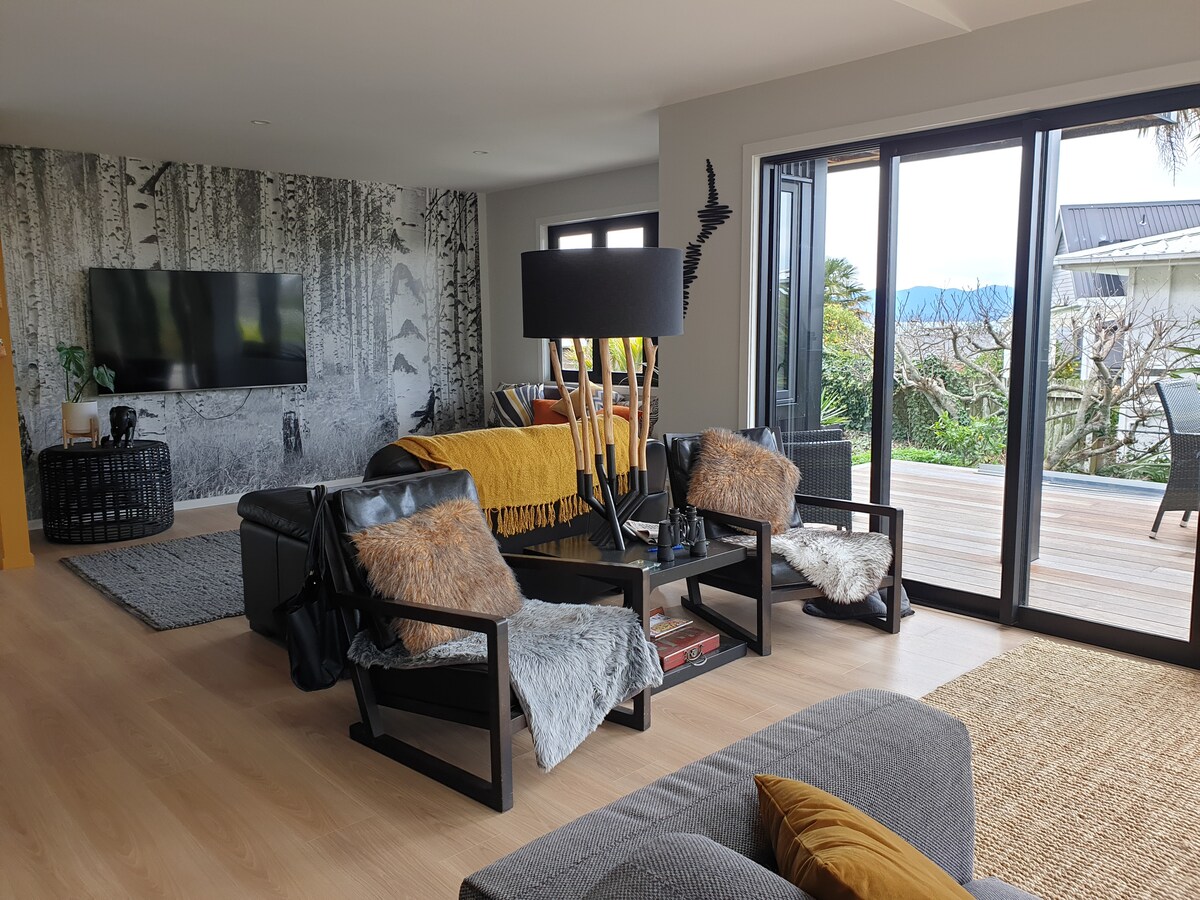 Lehne dich zurück und entspanne dich – in dieser ruhigen, stilvollen Unterkunft mit herrlichem Blick über das Tahuna-Erholungsgebiet, seine Spielfelder und mit freiem Blick auf die schöne Tasman Bay. Das Oceanview Apartment befindet sich im Herzen von Nelsons Tahunanui Beach – nur 150 m vom Strand entfernt, wo du deine Zehen im Sand wackeln, deine Rute auswerfen, ein erfrischendes Bad nehmen, Kitesurfen lernen oder ein Paddelbrett mieten kannst!