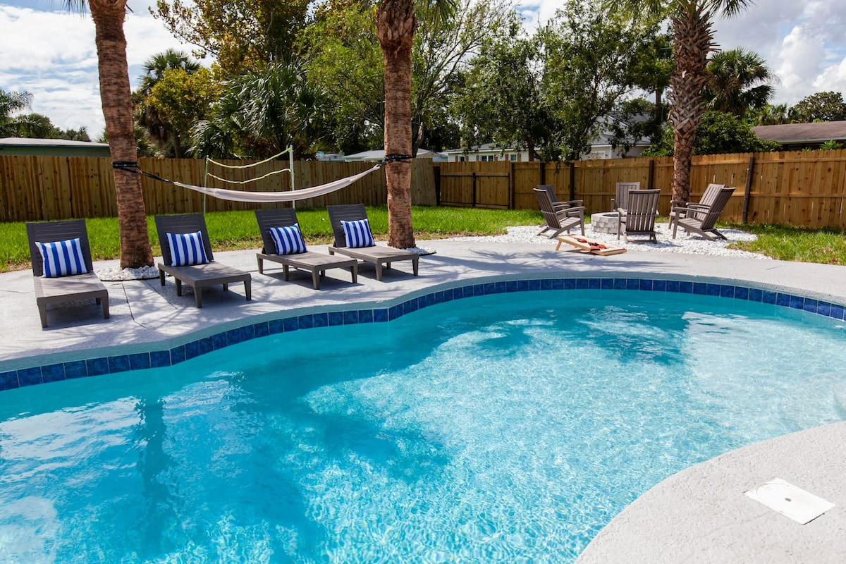 Dieses geräumige Haus verfügt über einen schönen privaten Swimmingpool und Liegestühle, die dir bei einer entspannten Zeit am Pool helfen. Perfekt für gesellige Zusammenkünfte mit Freunden und Familie, neben einem riesigen Hinterhof mit einem kleinen Volleyballspielplatz. **Der gesamte Raum einschließlich Swimmingpool und riesiger Garten mit Feuerstelle und Grill ist nur für dich privat ** 6 Blocks vom Strand entfernt 1 Minute Fahrt zum Strand 5 Gehminuten bis zum Strand 14 Minuten Fahrt zum Tournament Players Club: Golfshop