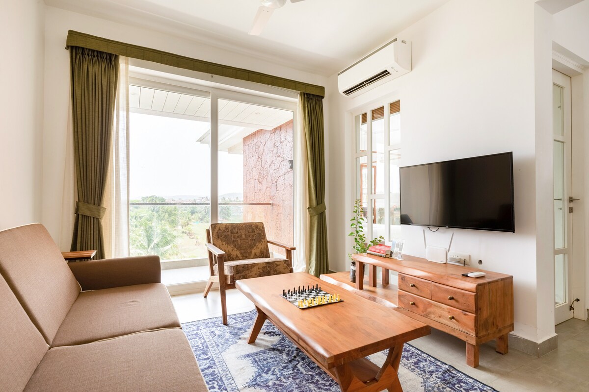 Luxury Apt with stunning view , Pool, Gym, Wi-Fi, Parking , AC & Kitchen. Indulge in the unique charm of our one-of-a-kind 2 bedroom apartment in Pilerne Goa, Just 5kms from Candolim beach, apartment is in a secure gated complex offers exceptional luxury, fully equipped kitchen, and daily housekeeping. The apartment features a living area with a TV, dining table, and an extra mattress for the 5th guest. Immerse yourself in the unparalleled experience exclusivity – a vacation home. Enjoy:)