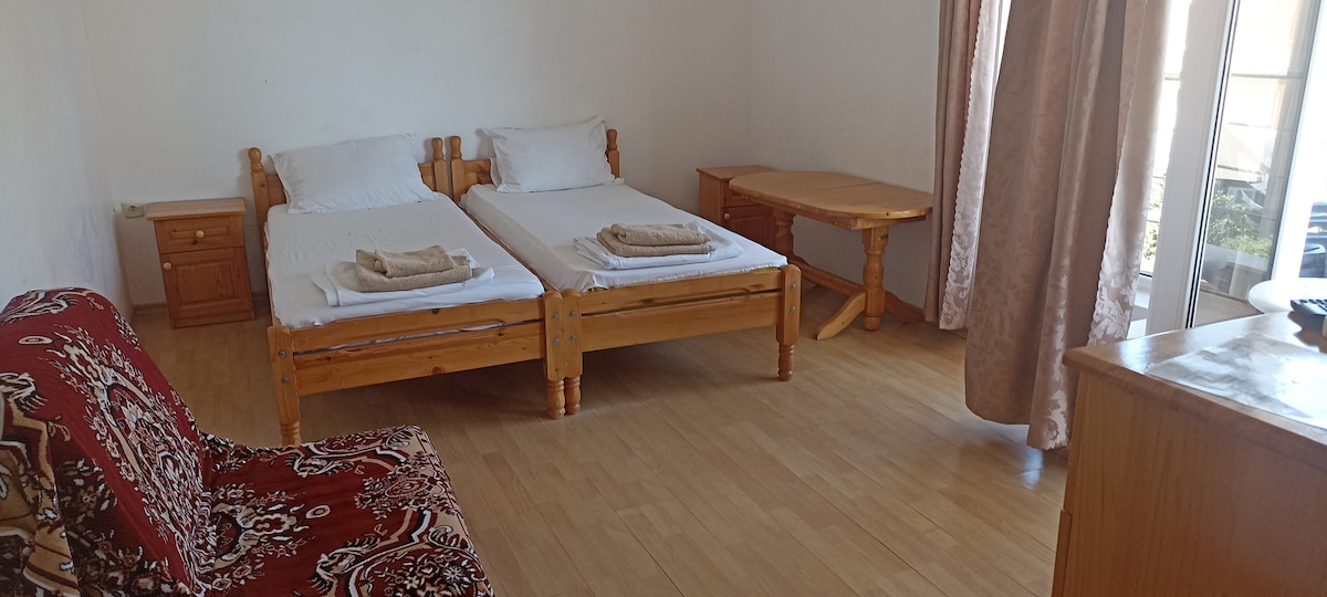 Wir bieten Ihnen Dreizimmerwohnungen mit zwei Schlafzimmern (für 5 und 6 Personen) und Küche sowie ein Studio (53 m², 4. Stock, 4 Personen, insgesamt 15 Gäste). Die Wohnung liegt im Zentrum von Sonnenstrand, Eingang A im 2., 3. und 4. Stock. In der Nähe befinden sich Bushaltestelle, Büro, Kurierdienst und Post, ca. 9 Gehminuten vom Meer entfernt. Das Gebäude verfügt über einen Aufzug, einen privaten Parkplatz, Lebensmittelgeschäfte, Fastfood und eine Apotheke.