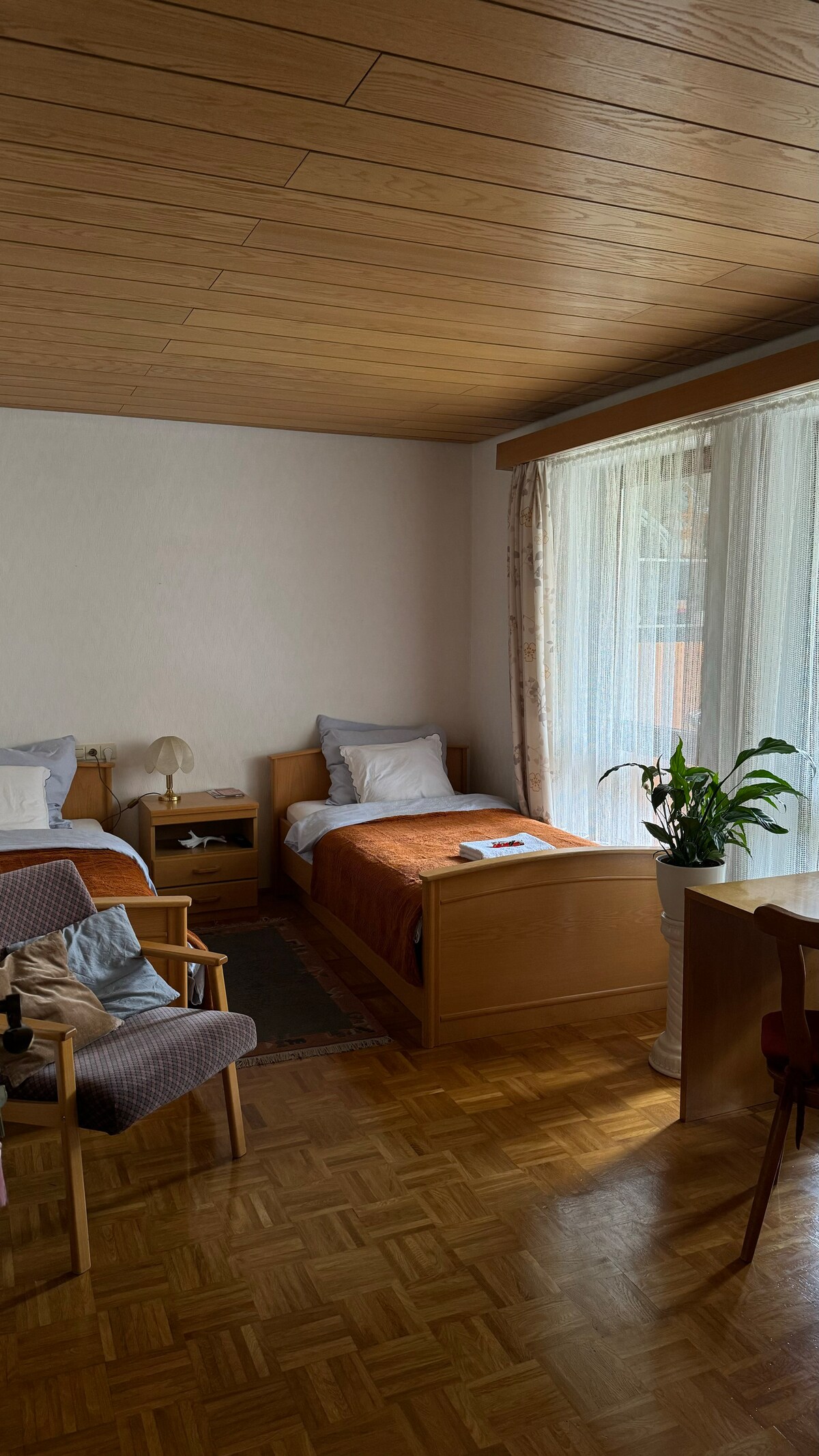 Das Zimmer Nummer zwei ist gemütlich und geräumig und für drei Gäste ausgelegt. Es verfügt über ein Doppelbett und einen Sessel, der in ein vollwertiges Bett für eine Person umgewandelt werden kann. Das Zimmer hat ein eigenes WC und eine Dusche sowie einen direkten Zugang zur Küche. Zudem können Sie den Aufenthaltsraum, die Bibliothek mit Schreibtisch, die Sommerterrasse und die Gemeinschaftsküche nutzen.