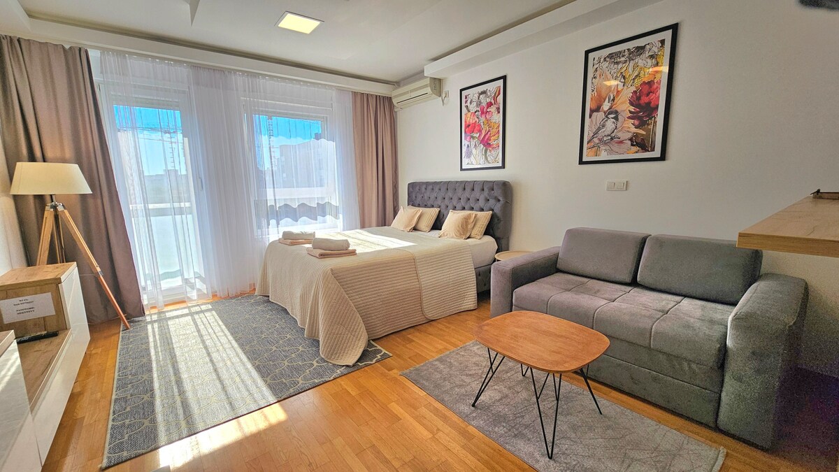 Modernes Studio in Neu-Belgrad | Geschäftszentrum + kostenlose Garage Übernachte in einem stilvollen, voll ausgestatteten Studio im Geschäftsviertel von Neu-Belgrad, ideal für Geschäftsreisende und Stadtforscher. Genieße einen eigenständigen Check-in, eine 24-Stunden-Rezeption, kostenfreies Highspeed-WLAN und eine private Garage. Gehe zu Fuß zu Büros, Einkaufszentren und Top-Restaurants, mit einfachem Zugang zum Fluss Sava, zum Flughafen und zum Stadtzentrum. Buche jetzt für einen reibungslosen und stressfreien Aufenthalt!