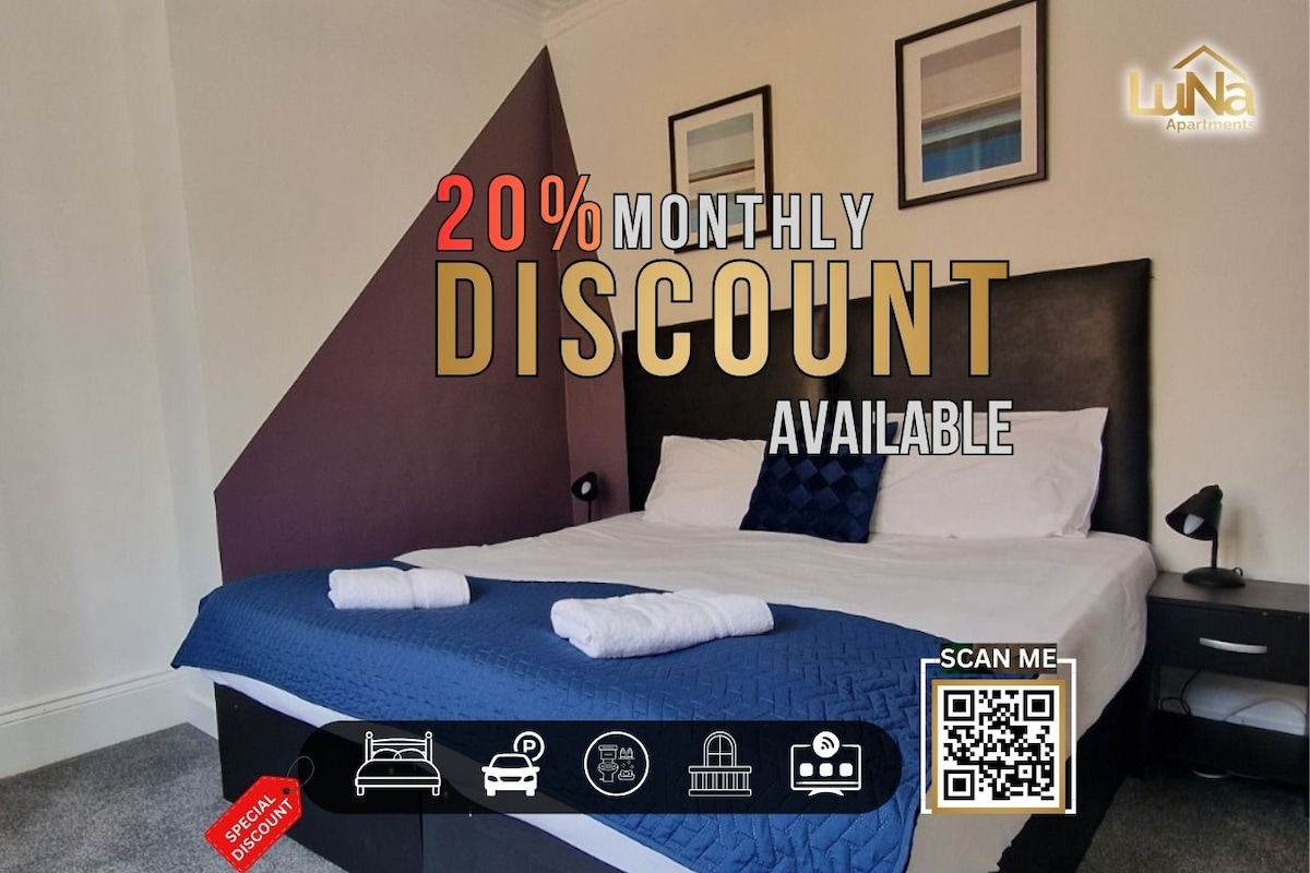 BUCHE NOCH ★HEUTE bei Dwellcome★ Home Ltd Vermieter-Verwaltungsdienstleistungen: Langzeit- (2-5 Jahre) problemlos/wartungsfrei (wir machen alles) garantierte Mietverträge ★Finde uns für den BESTEN Preis, Langzeitrabatte & Service direkt★ ✪ Moderne Wohnung mit 2 Schlafzimmern im 1. Stock ✪ 4 Betten; 1 Kingsize-Doppelbett (& Einzelbett), 1 Doppelschlafsofa ✪ Kostenloser Parkplatz ✪ Familienbad ✪ Gut eingerichtete Küche ✪ Essbereich ✪ Kostenloses unbegrenztes 100 MBit/s-Breitband ✪ Netflix TV ✪ Makellos ✪ Ruhige Gegend.