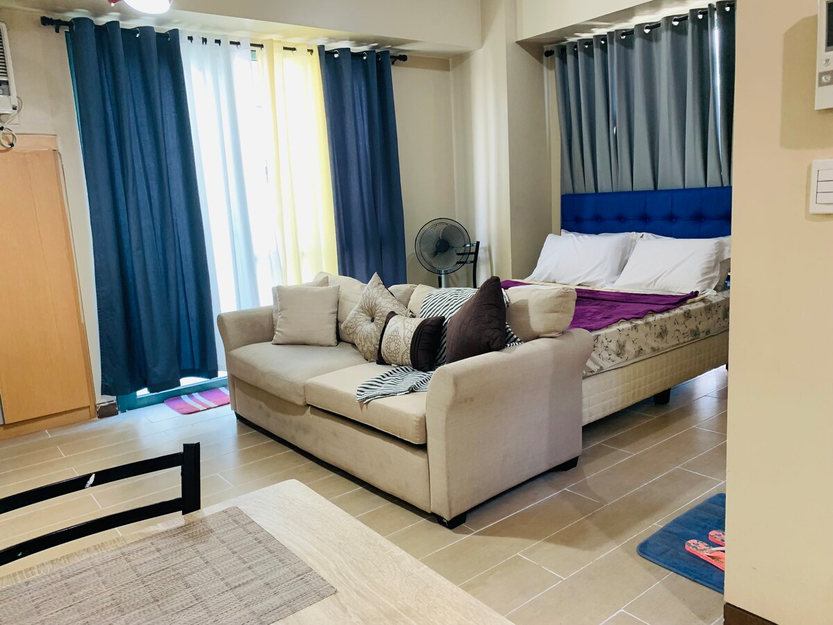 BITTE VOR DER BUCHUNG LESEN! Sicherheit: Ein amtlicher Lichtbildausweis muss dem Concierge vorgelegt werden. Tiefgarage: Reservierung für 400/Nacht erforderlich. Dies ist eine 32 qm große Studio-Einheit-Wohnung mit einem Balkon im 2. Stock, die NUR bis zu drei Personen bequem Platz bietet. Es ist ein zentral gelegener Ort gegenüber dem Flughafen NAIA Terminal 3 (10-15 Minuten zu Fuß).