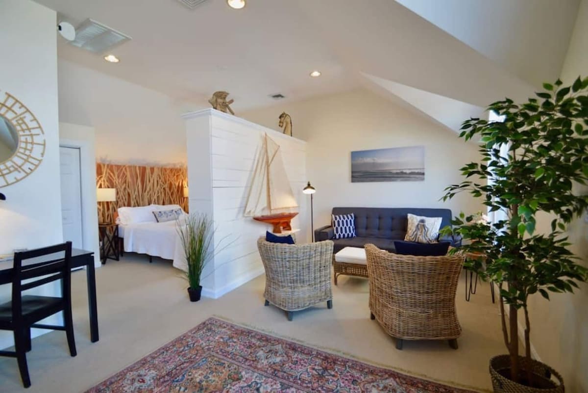Unsere PENTHOUSE SUITE: eine moderne 3-Zimmer-Wohnung für 5 Gäste mit Hafenblick und kürzlich renovierter Küche🐶 💕. Dieser offene Grundriss, die moderne Einrichtung und die private Terrasse mit Blick auf den Newport Harbor machen dieses Loft zum perfekten Ort für deinen Urlaub. 2 frisch renovierte Badezimmer, voll ausgestattete Küche mit Marmor-Arbeitsplatten. Wohnzimmer & Esszimmer mit modernen Antiquitäten - Aufenthalt in Newports begehrtestem Hotspot & inklusive 2 kostenlose Parkplätze abseits der Straße
