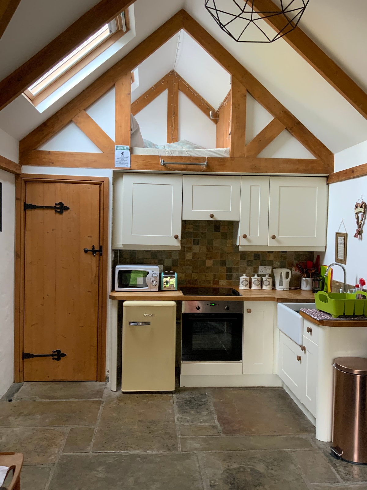 Eine komplett renovierte, unabhängige Loft-Wohnung Wir können je nach deinen Anforderungen entweder ein Super-Kingsize-Bett oder zwei Einzelbetten anbieten (bitte bestätige dies bei der Buchung). Private Treppe, überdachter Balkon, offenes Wohnzimmer, Klimaanlage/Heizung, TV, Sessel und Frühstücksbar/-tisch. Die Küche verfügt über einen Kombi-Backofen, ein Cerankochfeld und einen Kühlschrank. Das Schlafzimmer bietet Klimaanlage/Heizung, TV und ein doppelt verglastes Fenster mit freiem Blick. Das moderne Badezimmer verfügt über eine geräumige ebenerdige Dusche, frische Handtücher und grundlegende Pflegeprodukte.