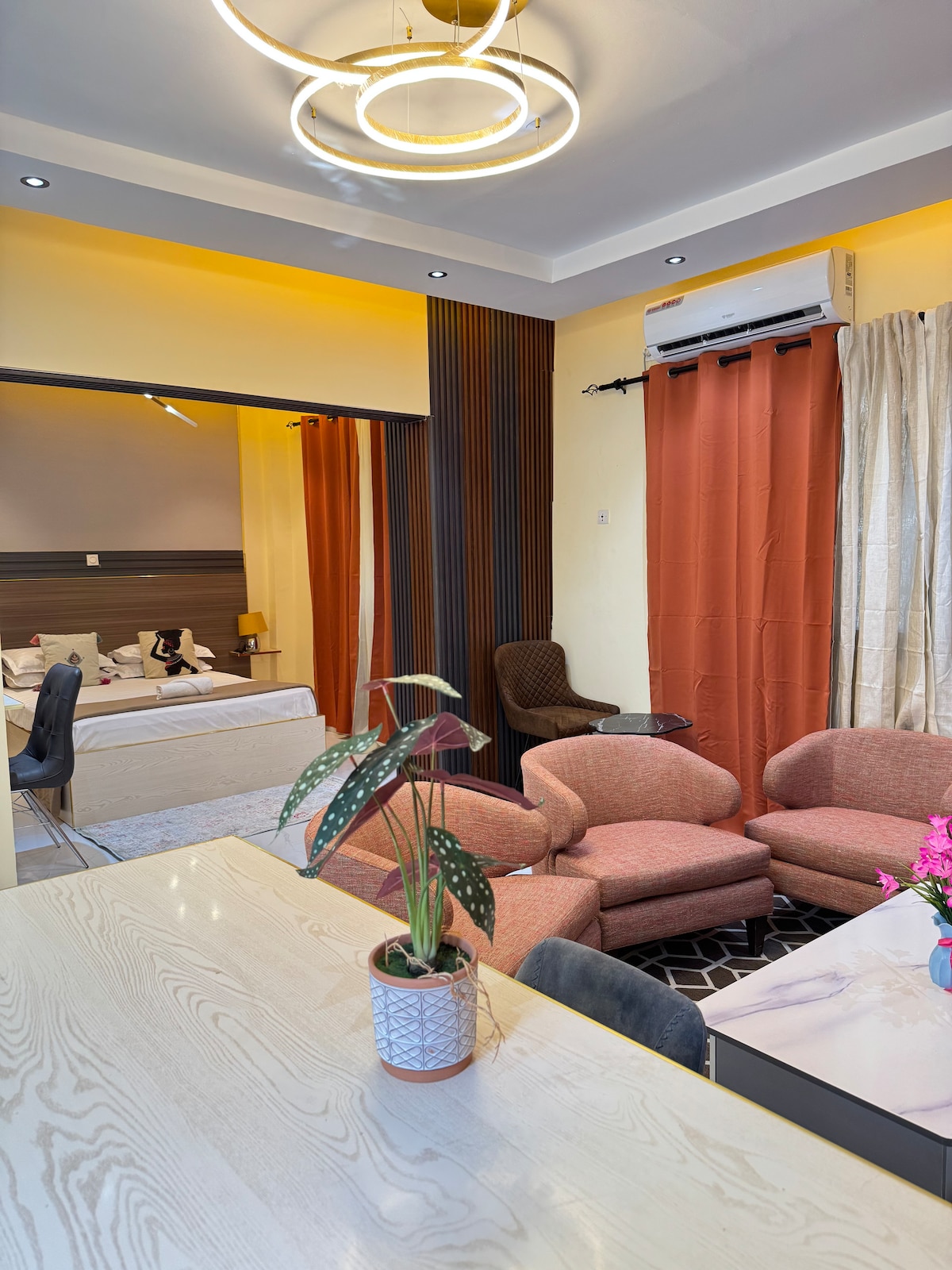 Passez un séjour agréable et reposant dans cette charmante Chambre-Studio au rez-de-chaussée de notre Villa familiale. L’espace est composé d’une chambre à coucher avec un lit double 180x190, d’une salle de bain et d’un salon spacieux et confortablement aménagé avec un canapé lit, une smart TV, une table-bar, un frigo et un micro-onde. L’électricité est à la charge du voyageur à travers la recharge d’un compteur wyofal.