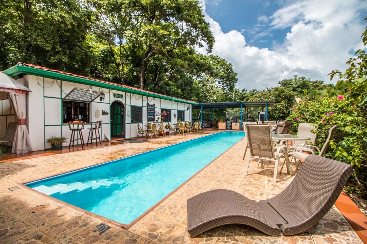 Only 6km to the beaches, restaurants, monkey sanctuaries, turtle refuge, zip lining, surfing, , kayaking, fishing, ATV tours, shopping, Nosara Airport. Comfy beds, views, breezes, sunrise, monkeys, wildlife, lap pool, Irish Pub, Draft Beers, Full bar, Full Menu. Fridge, toaster, air fryer/toaster oven, coffee maker in rooms, friendly attentive staff. Good for couples, solo adventurers, families (with kids), and big groups. Bird watchers, hikers NOTE: PUB CLOSED MONDAYS & TUESDAYS.