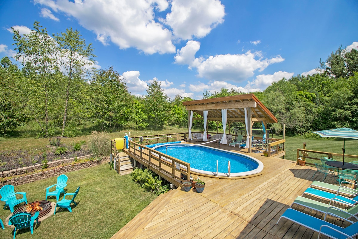 Bibi's Retreat - eingebettet zwischen 6.000 Bäumen entlang eines 15 Hektar großen abgeschiedenen Anwesens. Dies ist der ultimative private Kurzurlaub. Das Haus befindet sich in Niles, MI, und bietet 7 echte Schlafzimmer mit viel Platz für Mehrfamilienhäuser. Wir sind innerhalb von 30 min von 15 Weingütern und Brauereien. Wir sind innerhalb von 20 min von 10+ Golfplätzen und 20 Minuten von Notre Dame entfernt. Ladies Retreat, Golf Getaway oder Winery Tours ist diese Unterkunft perfekt für große Gruppen.