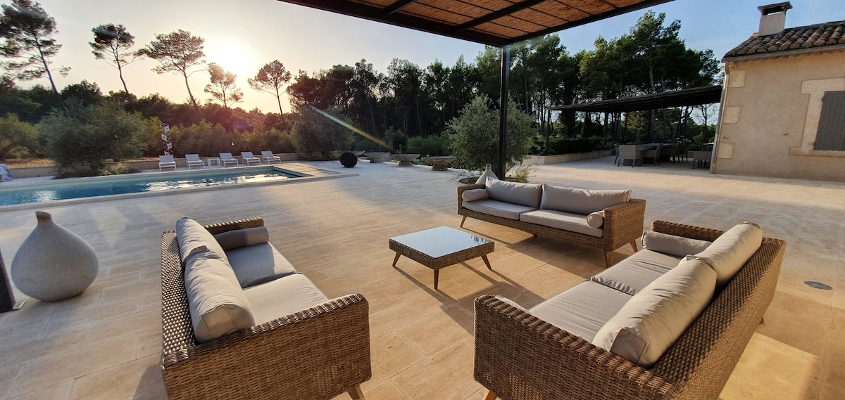 Unvergesslicher Urlaub mit erstklassigen Leistungen. Haus in idealer Lage in der Garigue von Nîmes, mit sicherem Pool und außergewöhnlicher freier Aussicht. Sie werden Folgendes lieben: - Die Aperitifs auf der Terrasse am Rande der Domaine d'Escatte - Voll ausgestattetes Anwesen, Klimaanlage durch Kanal - Haus bestehend aus zwei unabhängigen Wohnungen: das Haupthaus mit 3 Schlafzimmern (davon 2 Suiten) und eine Wohnung mit 2 Schlafzimmern - Babyausstattung und Kinderspiele - Sichere Parkplätze durch Tor