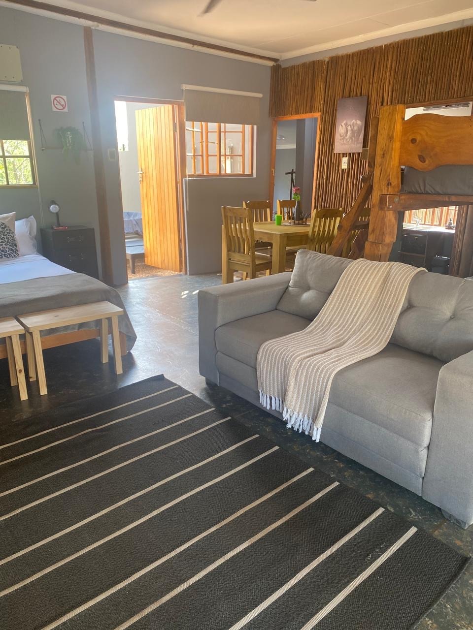 Highland Peace Haven is a spacious 3-bedroom retreat designed for comfort and relaxation. Unwind in extra king-size beds with luxurious Egyptian cotton linen and electric blankets for cosy nights. Enjoy the indoor fireplace, fast Wi-Fi, Netflix, and a reliable backup inverter system. The open-plan living area flows onto a covered patio with a built-in braai and pizza oven, plus a full-size pool table with a table-tennis top—perfect for family fun and relaxed evenings.