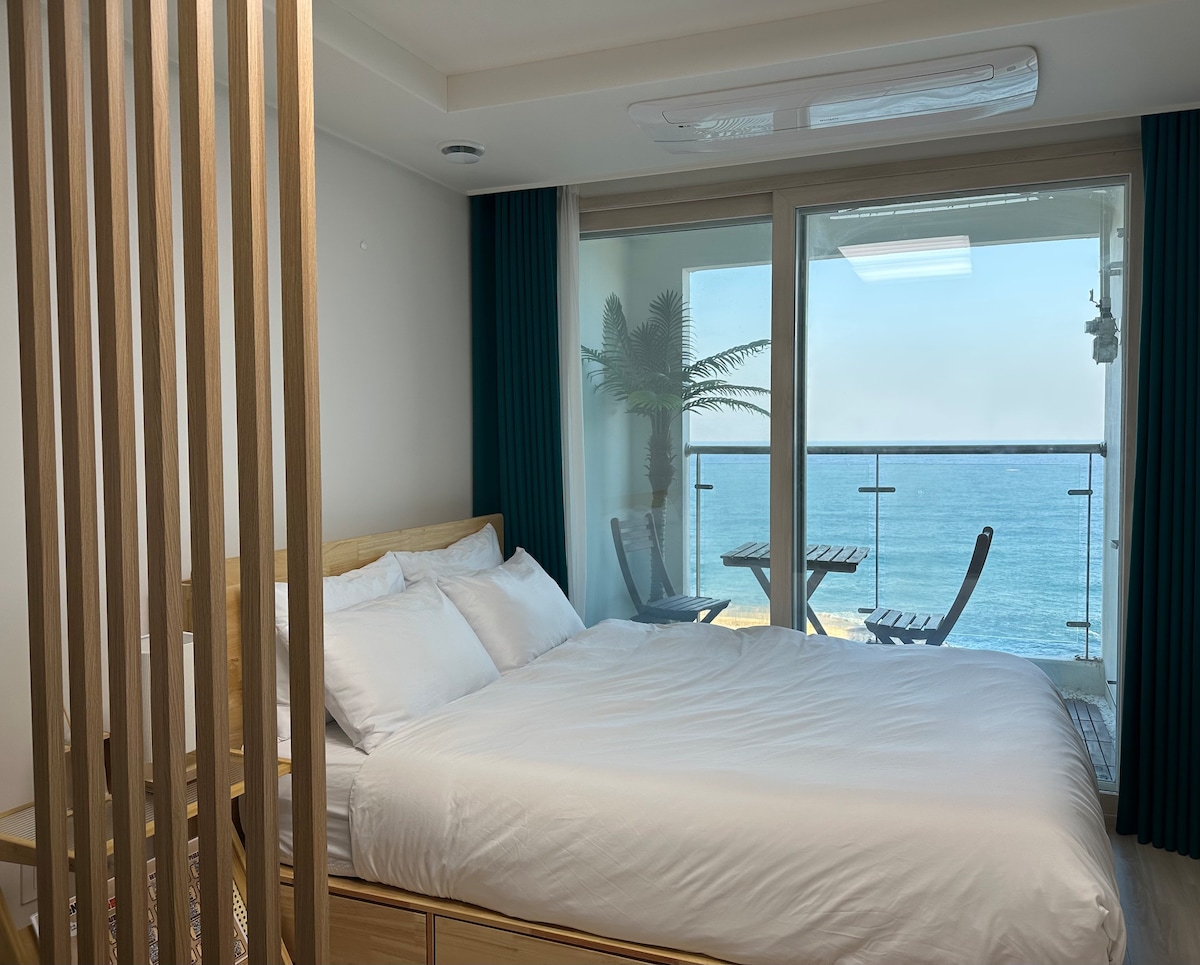 ✔️ Vor allem haben wir uns auf den Schlaf konzentriert! Ich habe die Matratze mit Memory-Schaum versehen, weiche Hotelbettwäsche und das bequemste Kissen, das ich je benutzt habe. Natürlich gibt es Verdunkelungsvorhänge für diejenigen, die lichtempfindlich sind! Die Schallisolierung ist auch mit Doppelverglasung am besten! ✔️30 Sekunden zu Fuß zum Deungdae Beach! Du wirst nachts die Wellen vom Balkon hören, und wenn du morgens aufwachst, wirst du jeden Tag das blaue Meer und den Blick auf den Himmel bewundern! (Atemberaubender Blick vom Bett) Genießen Sie die gemütliche Atmosphäre für eine lange Zeit, in der Sie sich entspannen können, während Sie auf das Meer blicken, das jeden Tag anders aussieht. ✔️ Das Zentrum von Sokcho Alle Sehenswürdigkeiten sind innerhalb von 10 km und in der günstigsten Lage💕 von Soyaste