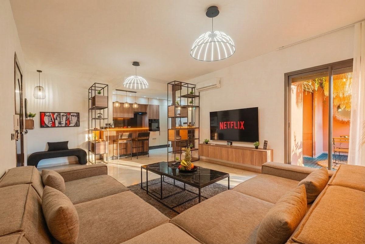Übernachten Sie im Herzen von Marrakesch in unserer Wohnung mit 2 Schlafzimmern und 2 Bädern. Genießen Sie hochwertige Simmons-Betten, Highspeed-WLAN (Glasfaser) und eine moderne Dekoration mit einem privaten Pool. Voll ausgestattete Küche, elegante Badewanne und italienische Dusche. Nur wenige Schritte vom Platz Jemaa el-Fna, der Plazza und dem Carré Eden entfernt. Der Pool ist nicht beheizt. Hinweis: Unverheiratete marokkanische Paare sind nicht erlaubt.
