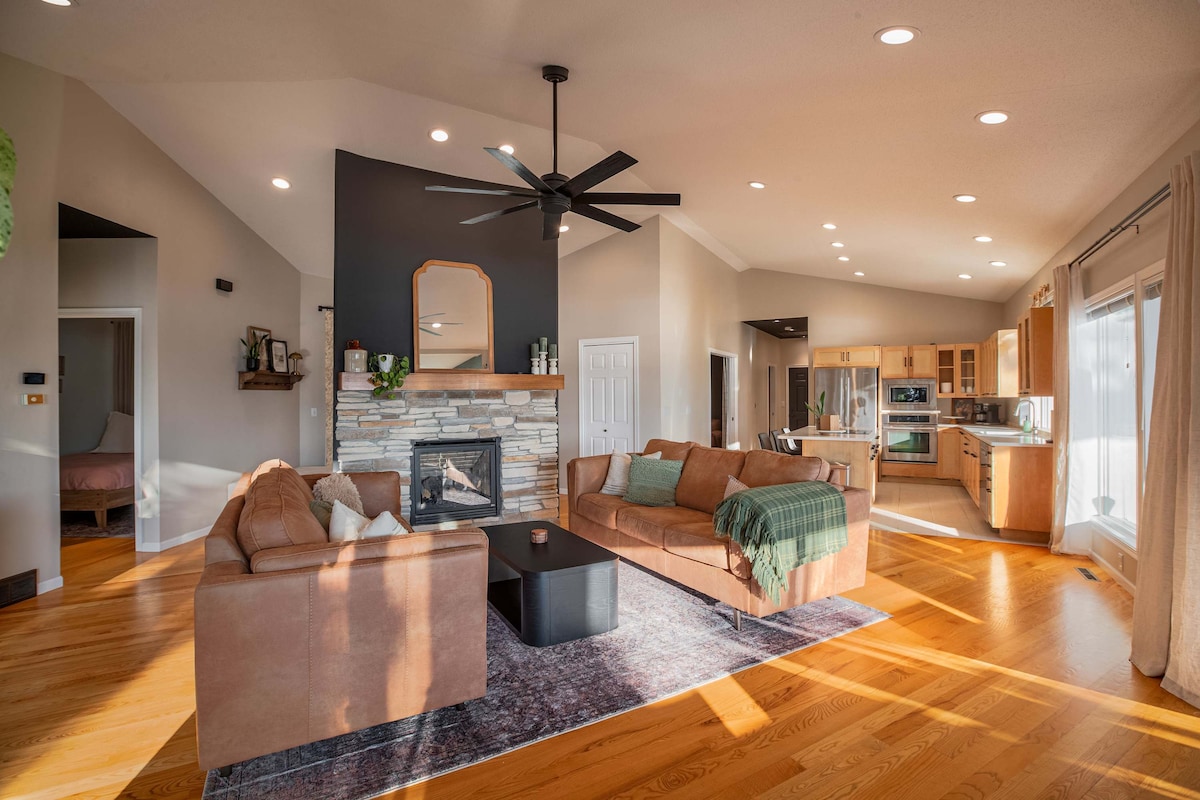 Location, comfort, and views for miles! This sanctuary is minutes from the Kickapoo Valley Reserve, Wildcat Park and nestled on 10 private acres with stellar views from the wraparound deck. This is THE place to immerse in nature then relax with a meal and a cozy fire. Soak your tired muscles in the claw foot tub after a fun day out exploring. Enjoy the cold A/C, the toasty fireplace, or the chef's kitchen. Families enjoy the kid gear and safe single level space for a low stress retreat