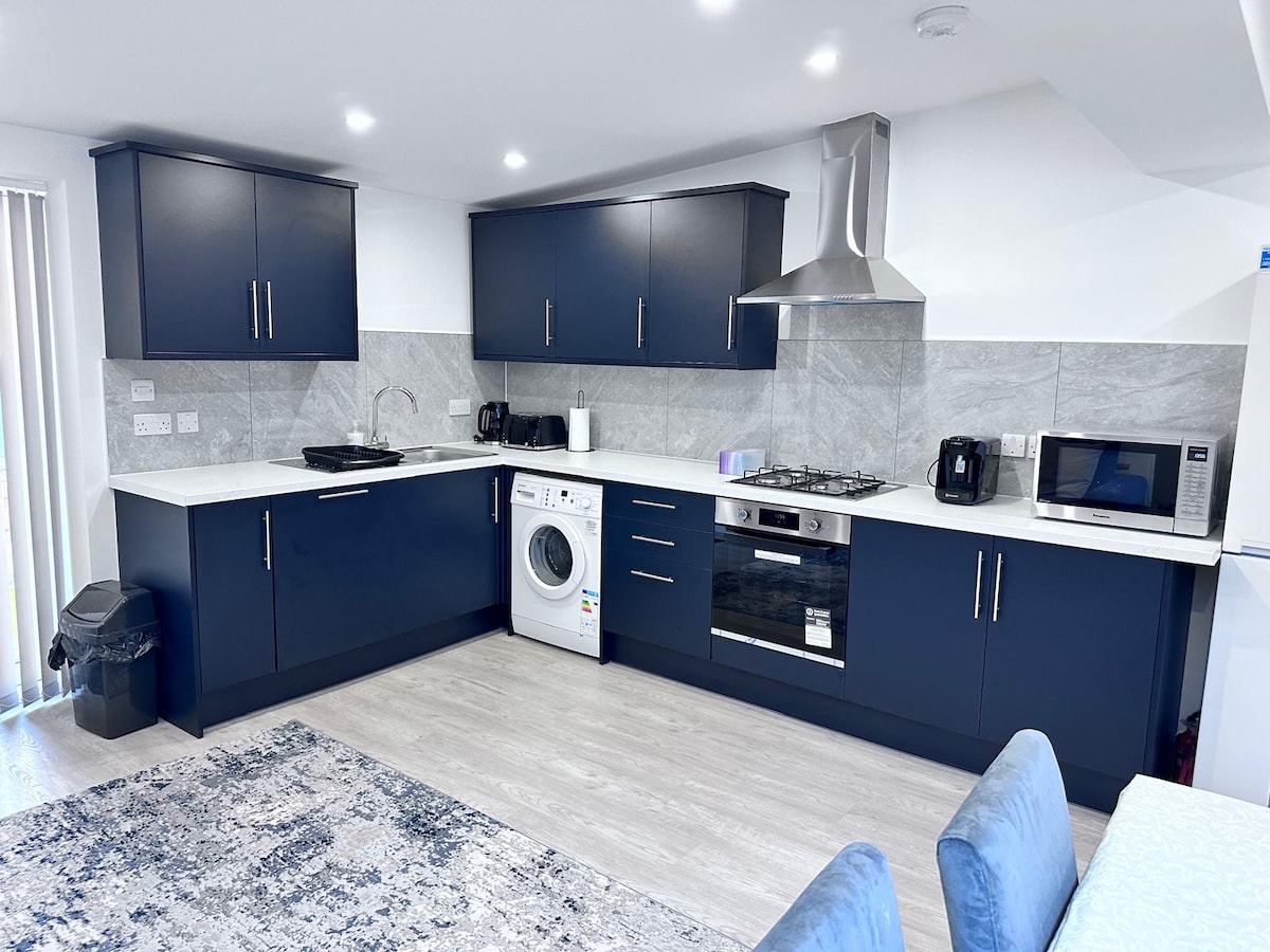 Unabhängige Luxus-Wohnung in einer umgebauten privaten Scheune in ruhiger Parklandschaft, nur 10 Gehminuten vom Bahnhof entfernt. Komfortabler, luxuriöser und offener Wohnraum und Balkon mit Aussicht. Ein Zuhause-von-Zuhause-Erlebnis mit einer voll ausgestatteten großen Küche, Waschmaschine/Trockner, Nespresso-Kaffeemaschine, großem Flachbild-TV, Playstation, schnellem WLAN – perfekt für eine Geschäftsperson oder ein Paar. Großes separates Schlafzimmer und Duschraum. Einfache Parkplätze zusammen mit deinem eigenen Innenhof mit Sitzgelegenheiten und Tisch.