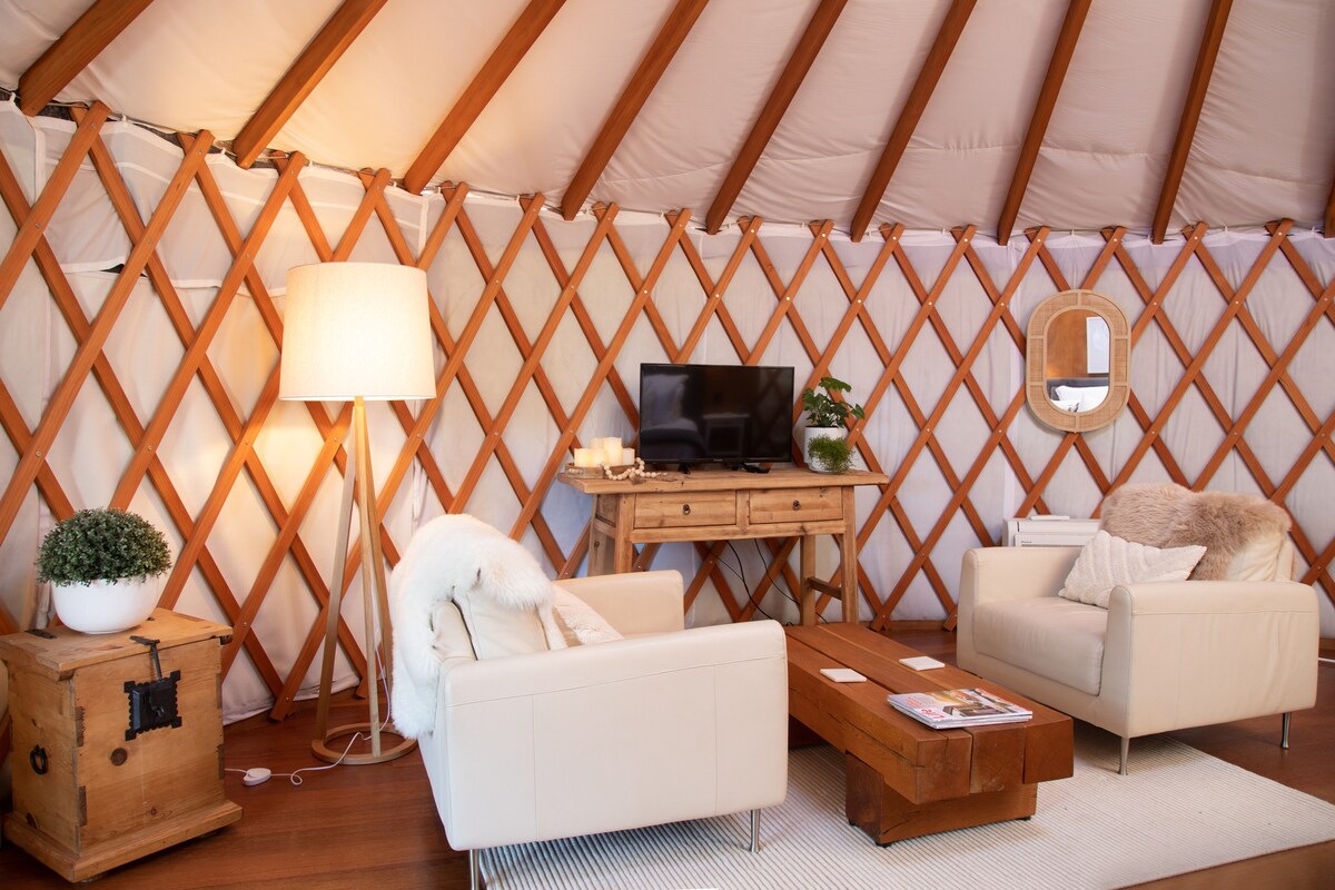 Das runde Zelt ist ein Boutique-Camping-Erlebnis in einer Jurte im mongolischen Stil. Der luxuriöse Campingplatz wurde entwickelt, um Entspannung und Romantik in einer einzigartigen Umgebung zu fördern. Alle stilvollen Annehmlichkeiten machen es zu einem wirklich neuartigen Urlaub. Du wirst deine Zeit an diesem romantischen, rustikalen Ort nicht so schnell vergessen, wo du dich wirklich zurücklehnen und entspannen kannst.