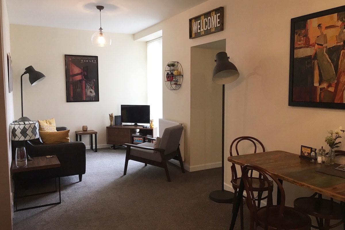 Moderne Erdgeschosswohnung in einer viktorianischen Villen-Umwandlung in ruhiger Lage im Stadtzentrum mit eigenem Parkplatz. Die Wohnung verfügt über einen eigenen privaten Eingang und besteht aus einem offenen Wohn-, Ess- und Küchenbereich, einem Schlafzimmer mit Doppelbett und einem Badezimmer. Es gibt einen kleinen Innenhof, der von der Küche aus führt.