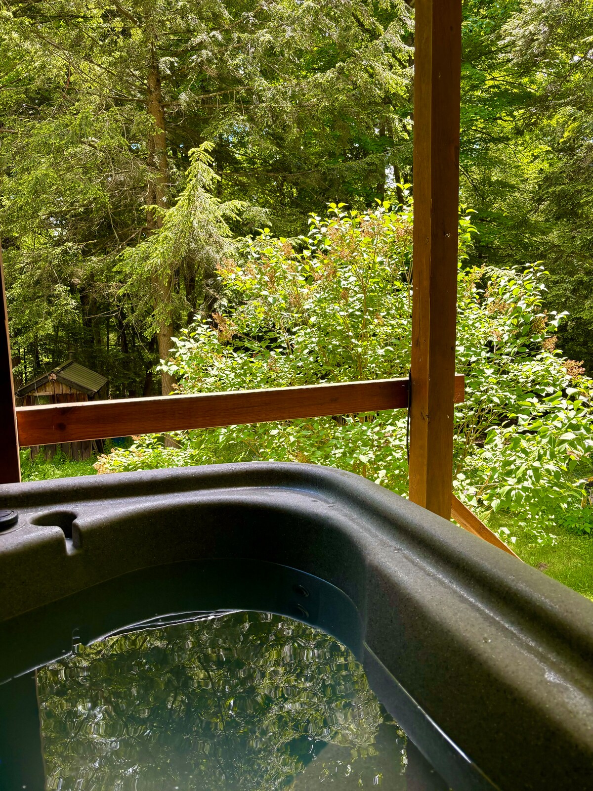 Dieser netzunabhängige, alternativ betriebene Ort befindet sich an der Vorderseite eines großen zwölf Hektar großen Anwesens, neben einem fließenden Bach. Erhöht über einer natürlichen Quelle, die das ganze Jahr über fließt, thront die japanisch inspirierte Ästhetik dieser privaten, winzigen Hütte auf einem Deck inmitten der bewaldeten Bäume mit Blick auf den Wasserweg, den die Mineralquelle speist, aber nicht bevor sie den im Boden versenkten, mit Zedernholz ausgekleideten, sprudelnden Whirlpool für zwei Personen füllt, der mit einem Holzofen beheizt wird. Einer von zwei Glamping-Plätzen auf den 12 Hektar.