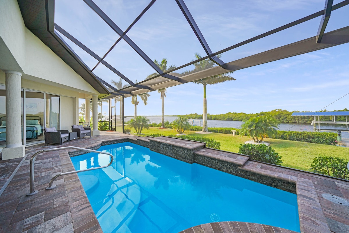 8 Schlafplätze mit privatem beheiztem Pool + Blick aufs Wasser! Nur wenige Gehminuten oder eine 5-minütige Autofahrt vom Port Charlotte Beach Park entfernt! Dieses Haus am Wasser, 3 Schlafzimmer, 2 Bäder, ist das Beste! Riesiger Pool mit Lanai zum Schwimmen, Treiben, Grillen und Entspannen. Nur wenige Minuten von Restaurants, Einkaufsmöglichkeiten und allem anderen entfernt! WLAN inklusive und 4 Fernseher, um deine Lieblingsfilme zu streamen. Voll ausgestattete Küche. Waschmaschine/Trockner. 30 Minuten zu den Hot Springs, weniger als 5 Minuten zu Lebensmitteln, Fisherman's Village. 15 Minuten zu PGD