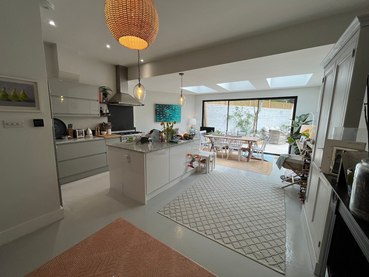 Ein atemberaubendes Familienhaus mit schönem Garten. Das Haus ist einen 3-minütigen Spaziergang vom Bahnhof Mortlake entfernt, mit Parkplatz an der Straße direkt neben der Haustür. Es gibt 2 Schlafzimmer mit Doppelbett (1 mit eigenem Bad), ein Familienbadezimmer und zwei Kinderzimmer mit großen Babybetten. Unten befindet sich ein intelligentes Wohnzimmer mit einem Feuer und einem großen TV. Eine unglaublich helle, geräumige Küche mit Sofa und einem weiteren Fernseher führt mit einem Homeoffice mit schnellem Internet, einem Heimtrainer und einigen Fitnessgeräten.