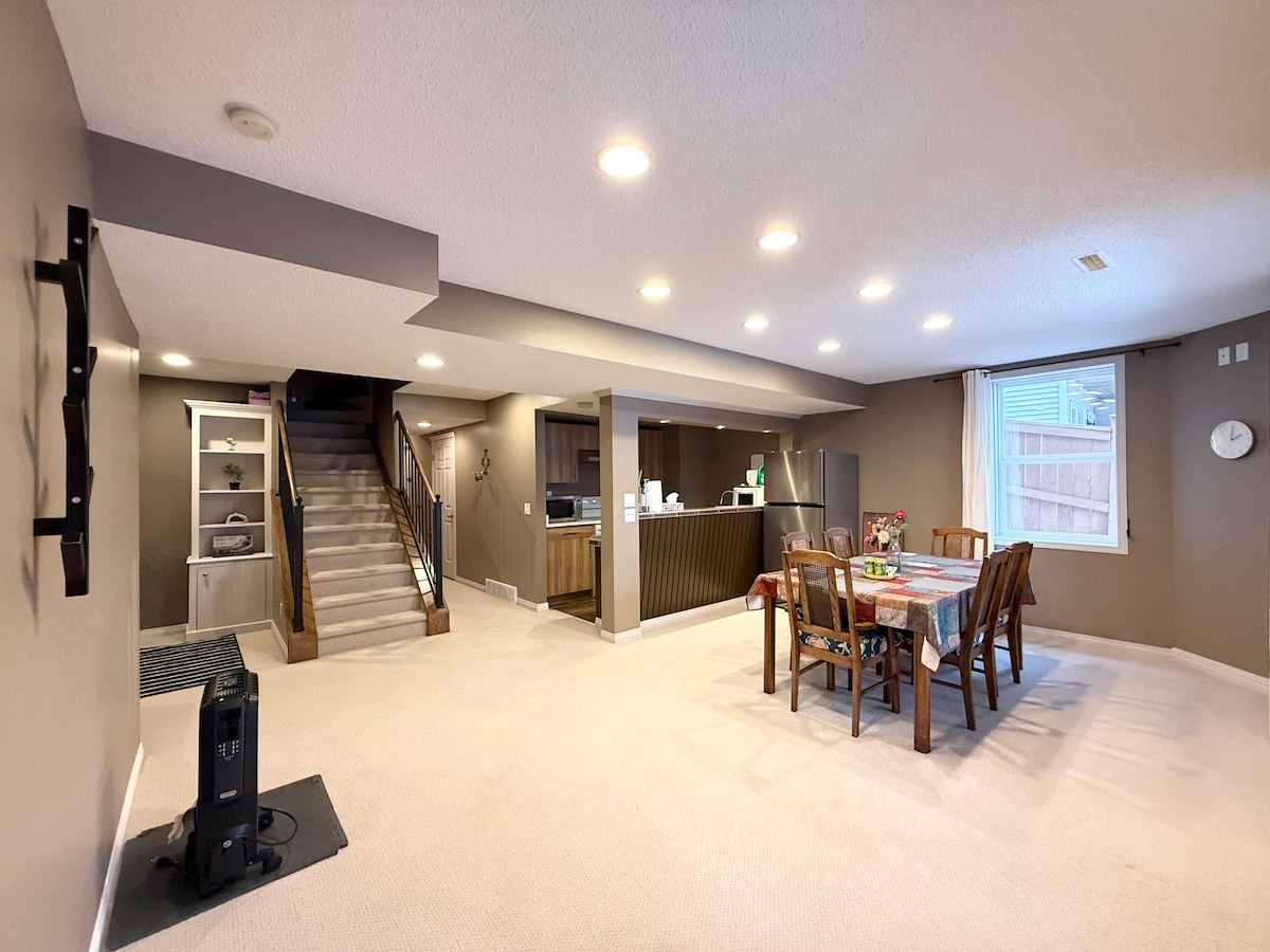 Things make our suite stand out: ★Safe &private parking pad ★Luxury memory foam King & Queen bed ★No shared air between spaces like hotels/condos (separate furnace & entrance) ★Sanitize in correct order to avoid cross-contamination ★Gorgeous Kitchen ★Safe & Cozy: 9’ ceiling, pot lights, big windows, CO smoke alarms, fire extinguisher ★Fibre Internet 300Mb ★Short drive to airport, perfect to explore Calgary, Drumheller, Banff, Kananaskis We'd love to invite you to stay here. Book with us TODAY