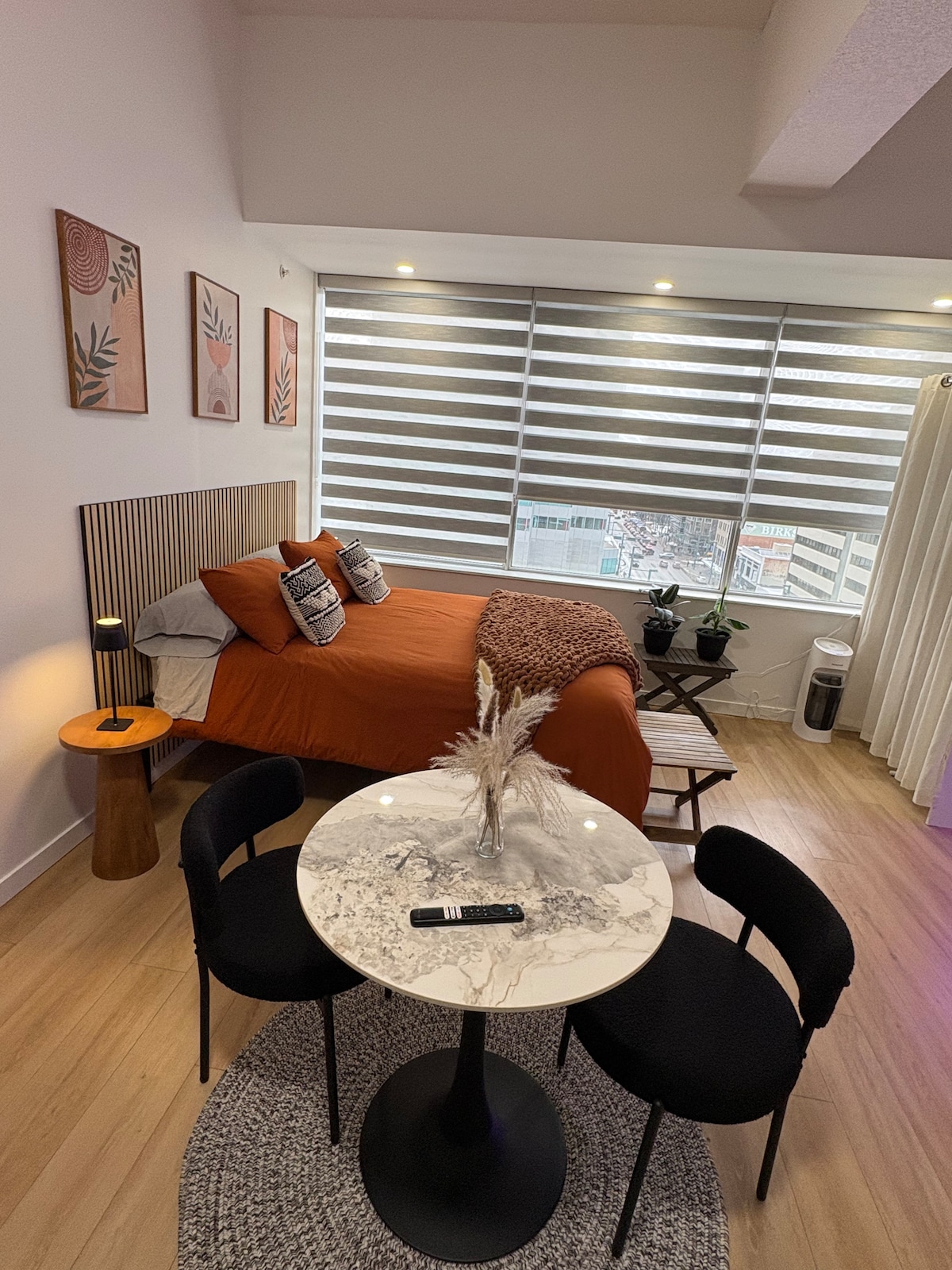 A fully equipped kitchen and cozy furnishings are perfect for longer stays. Use the pool and gym to maintain your excercise routine while you're travelling. Enjoy easy access to everything from this perfectly located home base. Take in stunning views of the city skyline from the balcony. You are just steps away from some of the city's best restaurants, cafes, and entertainment venues, walking distance to Rogers Place, MacEwan University and a quick transit to the University of Alberta.