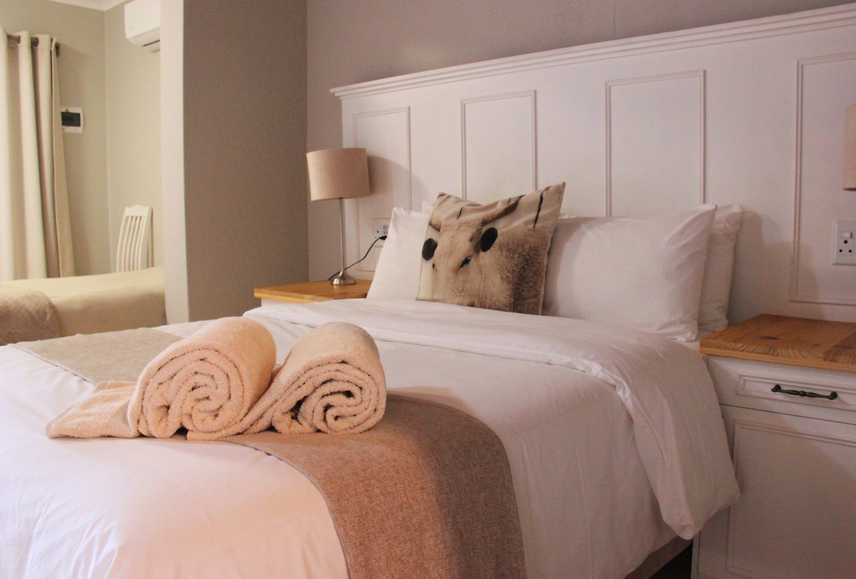 Groß mit Queensize-Bett, Esstisch+Stühlen, ein Badezimmer mit Dusche. Ausgestattete Küchenzeile (Kühlschrank, Mikrowelle, 2-Platten-Herd, Wasserkocher, Toaster, Waschbecken, Töpfe, Töpfe, Bratpfanne, Besteck ),DSTV. Klimatisiert. Gesicht der Straße. Parken und Braai auf der Rückseite von GH, WLAN