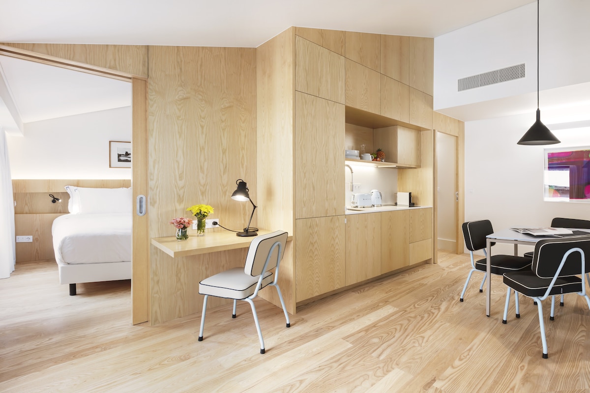 Apartahotel con 6 apartamentos ubicados en el paseo, frente a la Bahía. El Hotel Portmany construido en 1933, fue el primer hotel de Sant Antoni. Con reforma integral en 2021. Estudio Suite Los estudios cuentan con equipamiento completo: cocina funcional, baño de diseño, espacio abierto con área de comedor, cama tamaño king size convertible en dos camas y amplios ventanales en balcón con vistas. Diseño exclusivo con detalles del hotel original. Precio con desayuno incluido.