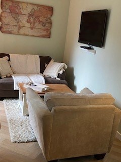 Our guest suite is calm and uncluttered with beautiful views. Guests have exclusive access to: One double bedroom One single/twin bedroom A third room with kettle, fridge, toaster, and microwave which can also serve as an additional single bedroom or relaxation space. Private bathroom with full bath. We provide a continental breakfast with cereal, yogurt, juice and freshly baked bread. Entrance is shared with our business premises and yoga and massage are available on site.