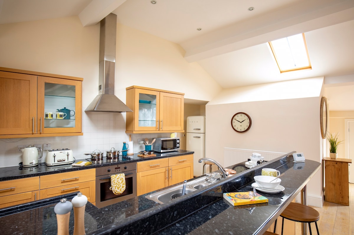 A hidden gem within the centre of Alnwick for self-sustaining modern guests. Everything you need is just a short walk away including the world renowned Alnwick Castle & Gardens. Our flat has two good sized bedrooms one with a Kingsize bed with fresh Egyptian cotton bedding and there are an additional two comfortable sofa beds. Bedroom one has an ensuite with shower and there is also a main bathroom with a bathtub. A lovely light and spacious flat including a lounge-kitchen room.