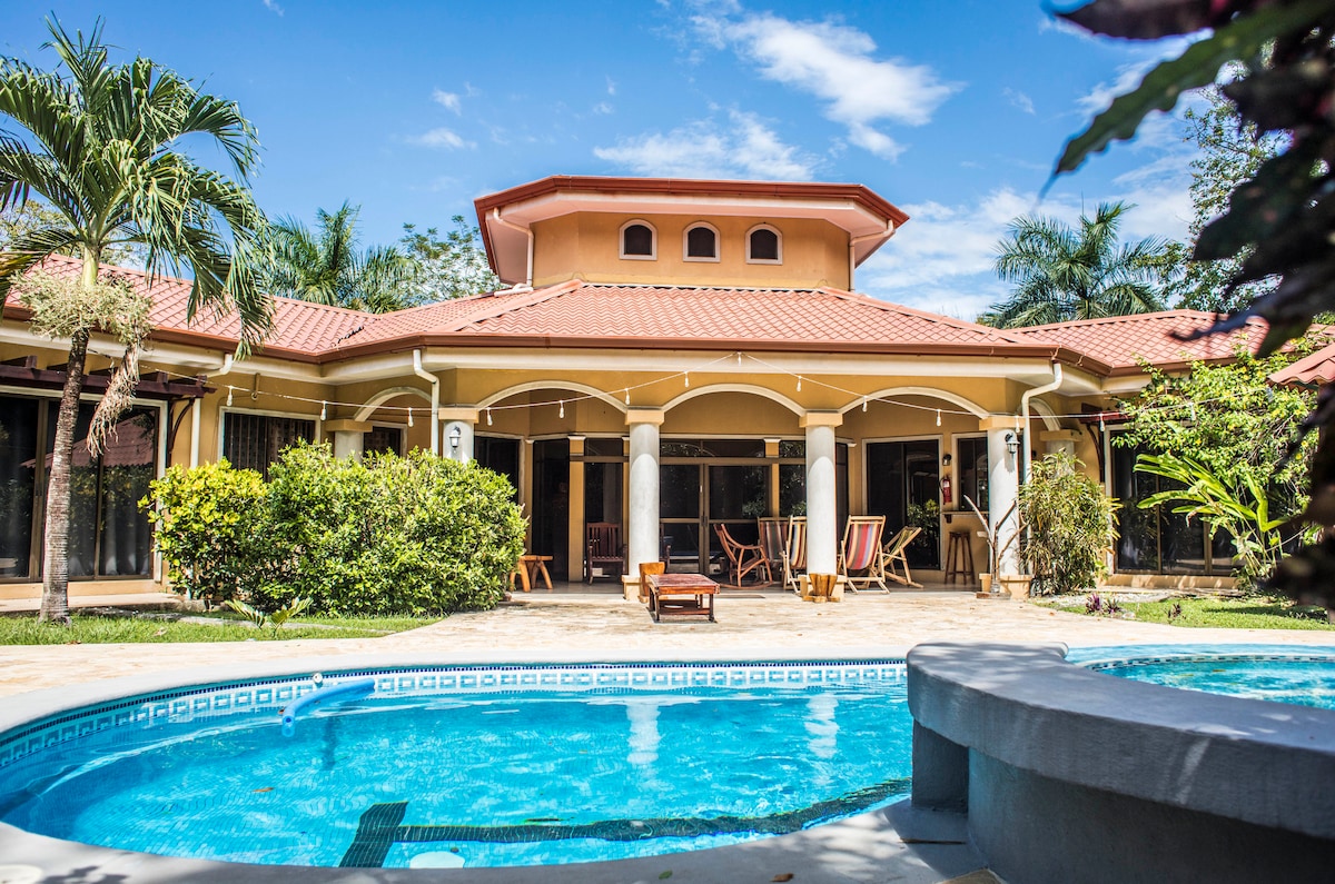 Schönes Haus nur 2 Minuten vom Pelada Beach und 8 Minuten von Guiones Waves entfernt. Genieße einen tropischen Garten mit Palmen, Blumen, Vögeln, Eichhörnchen, manchmal Affen. Du teilst den Pool. Nur wenige Schritte entfernt: Peperoni Pizzeria, ein italienisches Eisgeschäft und das berühmte Restaurant La Luna mit herrlicher Aussicht – alles zu Fuß erreichbar. Genieße vor Ort hausgemachte Küche: frischen Fisch des Tages und Gerichte, die mit Liebe zubereitet werden. Mach Yoga oder Kampfsport in unserem Shala und Dojo. Ein privater und ruhiger Ort