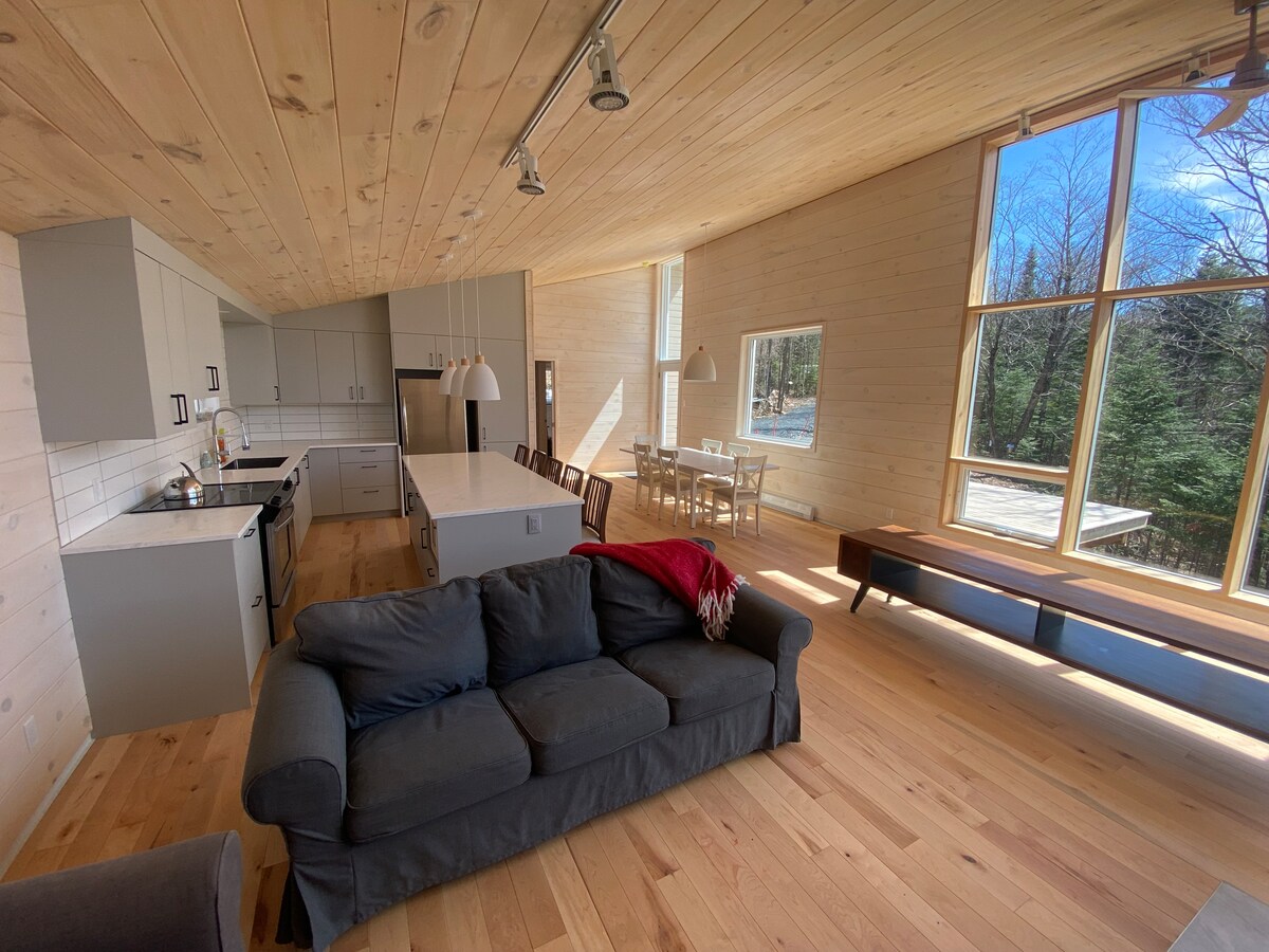 Découvrez ce superbe chalet scandinave au cœur des bois, à moins de 20 minutes du Massif du Sud. Niché sur un vaste terrain privé, il allie design moderne, lumière naturelle et confort absolu. Profitez des sentiers, de la raquette, du ski, du vélo de montagne, de la motoneige ou simplement du calme de la forêt. Son design à aire ouverte et sa fenestration créent une atmosphère apaisante, parfaite pour décrocher. Un lieu unique pour se ressourcer, en couple, entre amis ou en famille!