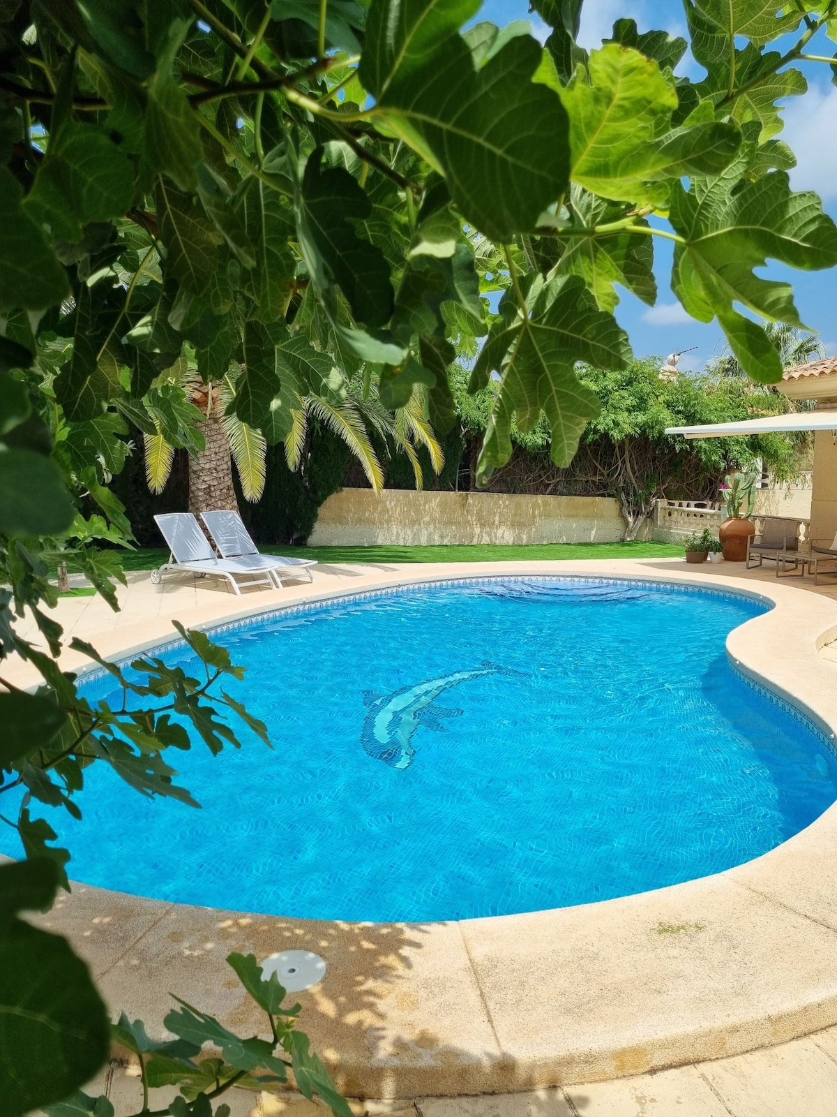 SONDERANGEBOT FÜR GRUPPEN VON FREUND@INNEN! BESONDERS FÜR RADFAHRER UND SPORTLER! Villa Carousel ist ein 500 m² großes Anwesen. Mit einer Kapazität für bis zu 15 Personen, privatem Pool, Multisportplatz, Grill und Parkplatz. Das Hotel liegt in Benidorm, 8 Minuten vom Zentrum entfernt. Neben Terra Mítica und Aqua Natura. Eine perfekte Lage mit der Ruhe der Landschaft und der Nähe des Stadtzentrums. Sie bietet Privatsphäre und Ruhe. Bereich für Radfahrer usw., in der Nähe von Golfplätzen und Supermärkten.