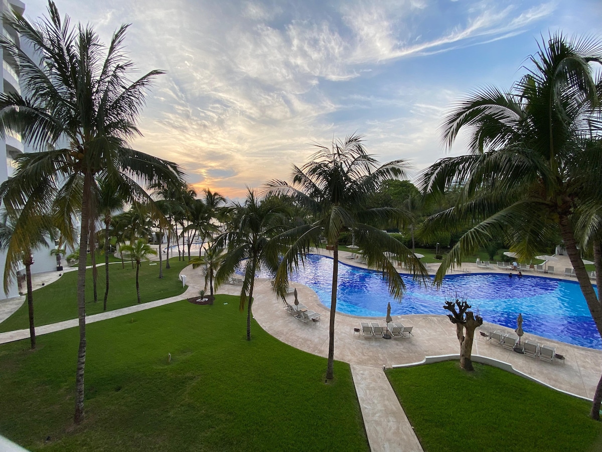 Welcome to our 7th-floor condo, where you can soak in the breathtaking view of our amazing pool and Golf Club! You'll have access to the facilities of one of the top 10 best resorts in Mexico: Vidanta - the Grand Mayan. Enjoy all the resort amenities: pools, gym, a kids' area, a waving pool, +44 restaurants, bars and cafés, lazy river, golf course, tennis , beach. It's the perfect blend of luxury and affordability for an unforgettable stay.