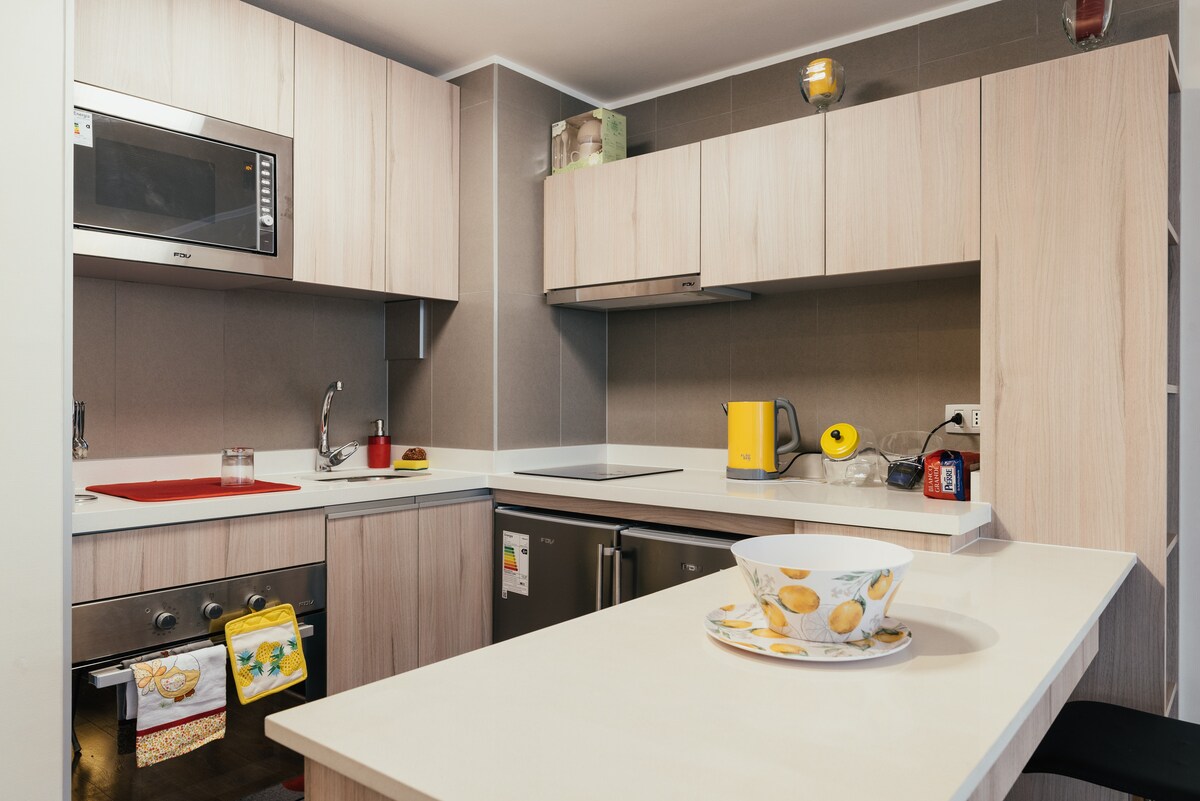Cozy and harmonious minimal style apartment fully equipped for 4 people, Wi-Fi, 24 hrs autonomous entrance and concierge, private parking, common areas and services included. Excellent location! Safe neighborhood, one block from the Santa Isabel metro, walking distances to Barrio Italia, Providencia, Santa Lucía hill, San Cristóbal hill and Plaza Italia (Plaza Dignidad). Close to banks, ATMs, supermarkets, warehouses, bakeries, cake shops, cafes, pubs and restaurants.
