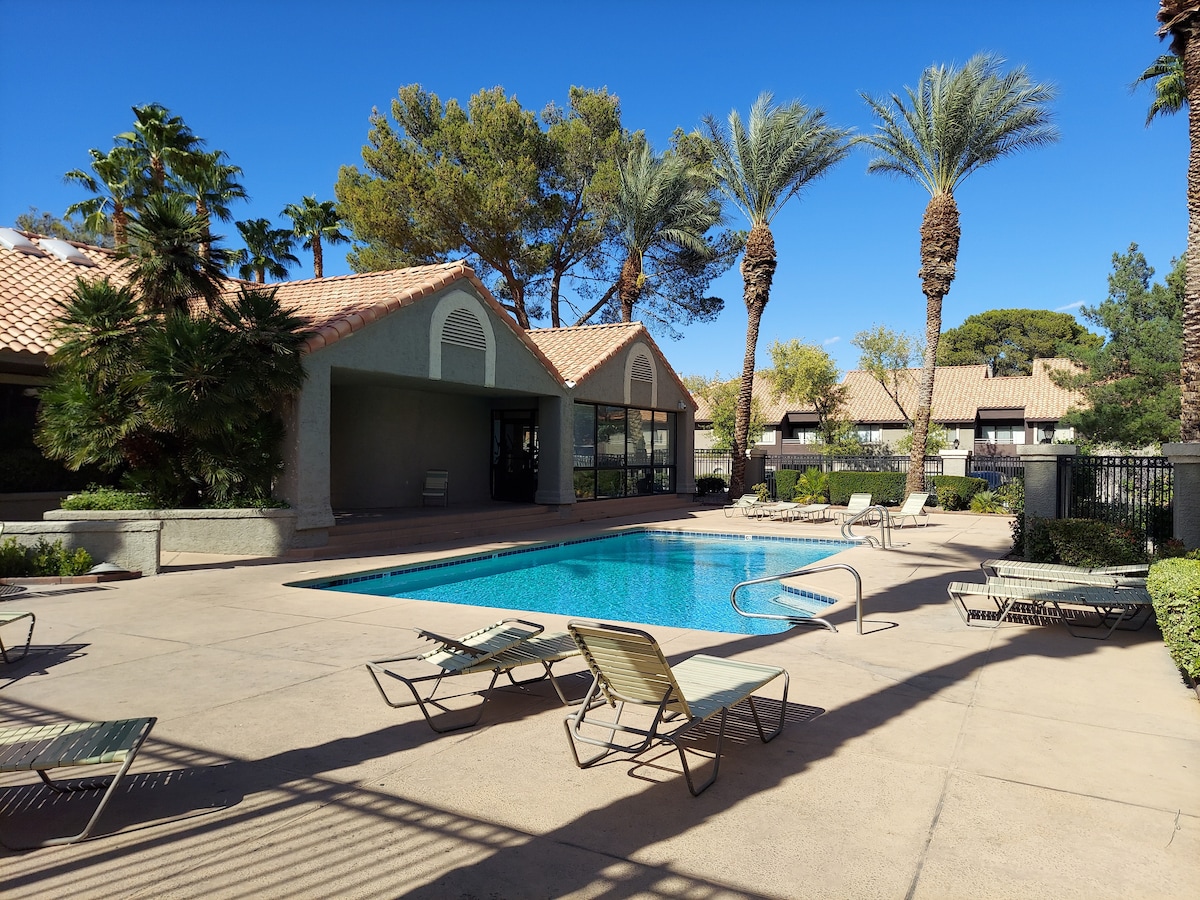Your beautiful 1-bedroom private suite awaits, featuring a studio kitchen, private full bathroom, dining table, games, workspace, cozy living room with coffee bar. Relax in your private oasis with a beautiful backyard, big pool (3-10ft deep) and heated spa. Perfect to unwind after a thrilling day in Vegas. Suitable for a romantic getaway, family trip, or solo vacation! Book now and experience your ultimate vacation! Enjoy total privacy with a separate entry and no host interaction.