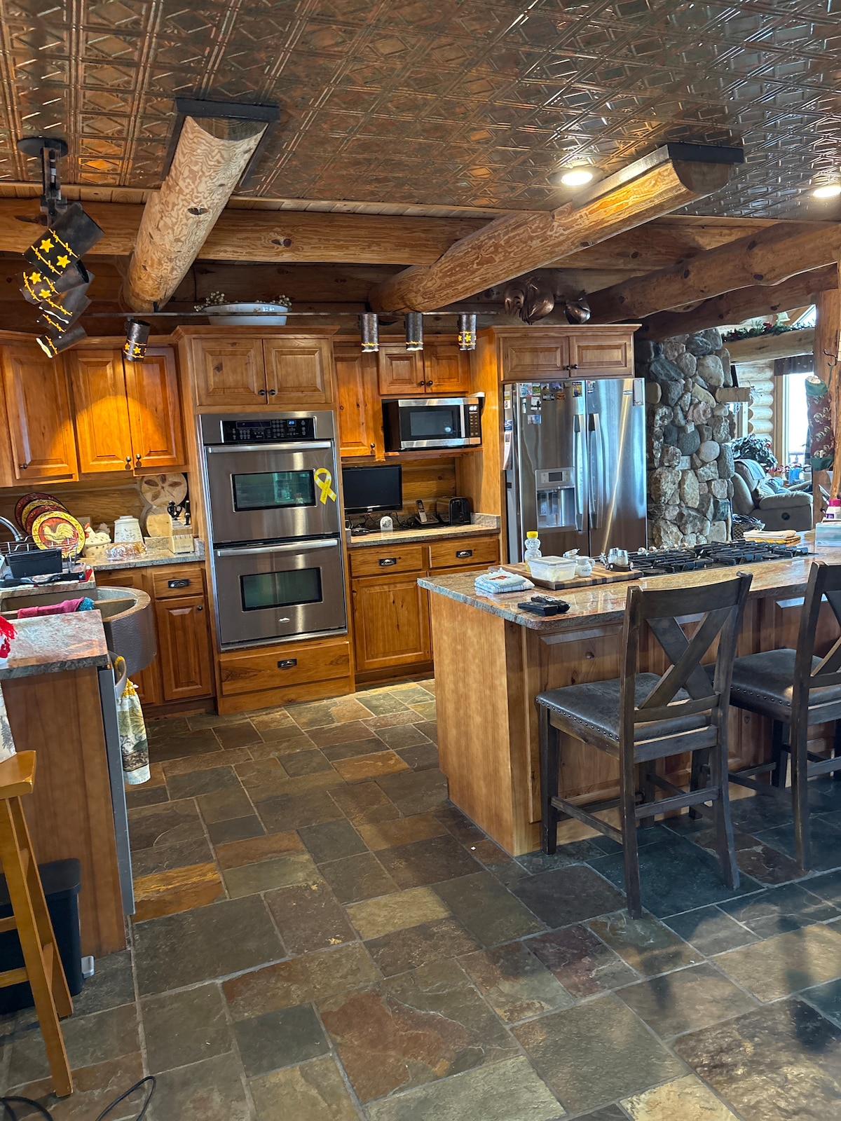 Log cabin just minutes away from the Missouri River, public beach, marina & airport. Plenty of indoor and outdoor space for entertaining. Perfect for family gatherings, fishing and hunting trips. This This three-story cabin can sleep up to 14, includes 5 bedrooms, 10 beds and 3 bathrooms. Fully loaded kitchen with plenty of seating, front/rear decks and walkout basement. Large loft. Garage has game room with mini pool table & foosball. Outdoor propane grill, large yard, swing set & playhouse.