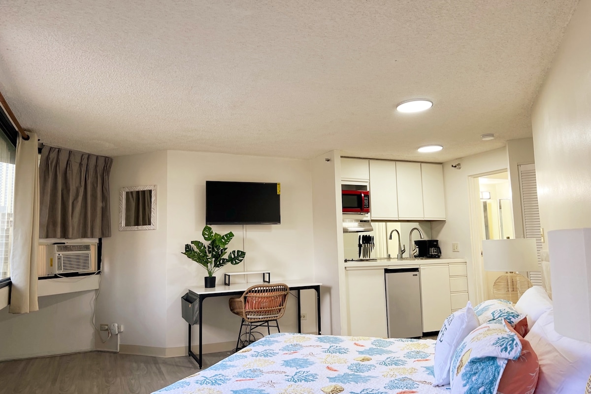 Erlebe unser neu renoviertes Studio im Royal Garden Waikiki. Tauche ein in das pulsierende Stadtleben mit nahegelegenen Einkaufs- und Restaurantmöglichkeiten oder mache einen gemütlichen 12-minütigen Spaziergang zum legendären Waikiki Beach. Dieses voll möblierte Studio verfügt über zwei Queensize-Betten und eine Küchenzeile. Genieße moderne Annehmlichkeiten wie kostenfreies WLAN, Kabel und Klimaanlage. Diese Einheit in der oberen Etage bietet einen Blick auf die Stadt, Ala Wai und einen Blick auf das Meer.