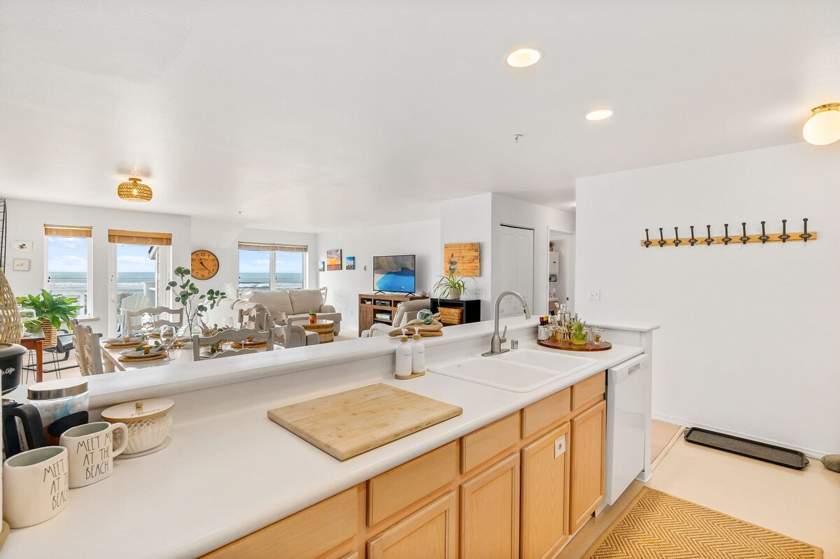 Do you like the sound of the ocean? Come and experience this amazing ocean front 2-story Condo on the corner overlooking the Pacific Ocean in Ocean Shores, WA, Quite location. Just open doors and hear the ocean from the upper or lower decks. Upstairs large bedroom, queen size bed with jacuzzi over looking the ocean. full size bath. Downstairs full kitchen, living room looking out to beach, smart TV with cable. Short Walk,and your feet are in the sand. (2 people)