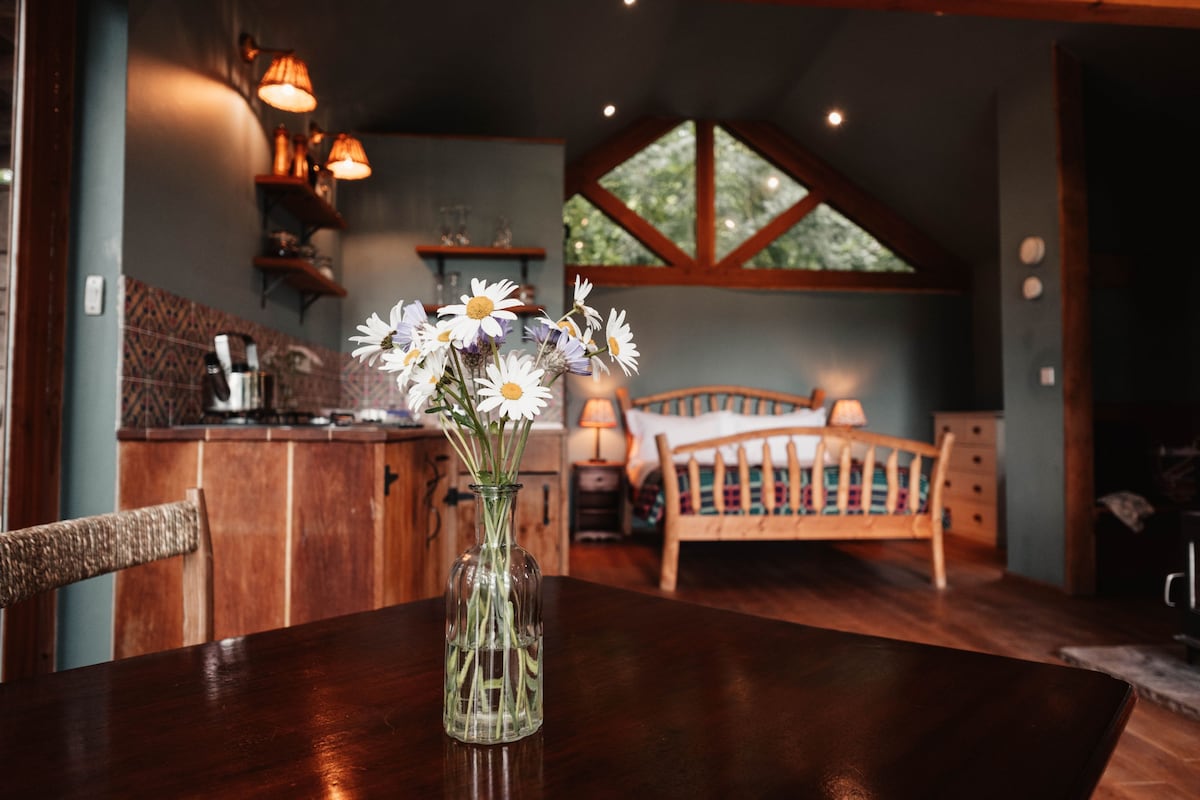 Der einzigartige Tin Shed wurde mit nachhaltigen und recycelten Materialien entworfen, mit Original-Kunstwerken von lokalen Künstlern und mit natürlichem Licht gefüllt. Es ist mit Holz ausgekleidet, was ein warmes und natürliches Ambiente schafft, und es hat auch einen Holzofen. Eine kompakte, gut ausgestattete Küche, ein Wohnbereich, ein Badezimmer im Erdgeschoss mit einer Power-Dusche und einem WC. Im Obergeschoss befindet sich ein großzügiges Schlafzimmer mit einem Super-Kingsize-Bett oder zwei Einzelbetten und einem schönen Blick auf die hügelige Landschaft aus einem Panoramafenster. Draußen befindet sich eine Terrasse und eine Feuerstelle.