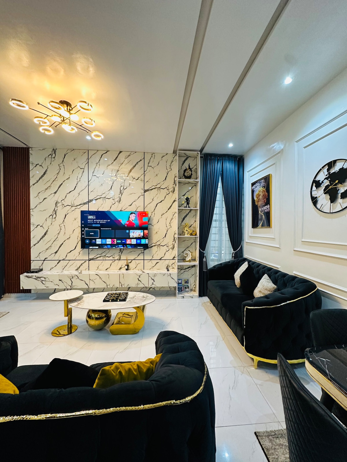 Experience a 5-star hotel feel with the comfort of home in this newly refurbished second-floor apartment. Bedroom and living room each have a TV, separated by mahogany wood profiles. Enjoy your private sitting area, AC, refrigerator, 55-inch smart TV, and a modern kitchen with a 4-burner stove. The bathroom has hot, pressurized water, electricity is 24/7, security is round-the-clock, and super-fast WiFi is ideal for working guests.”