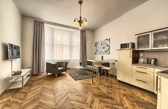 Die elegante, klimatisierte Wohnung ist ein verstecktes Juwel mitten in der historischen Altstadt von Prag. Die Wohnung ist hell, geräumig und sehr ruhig. Es liegt in der Nähe aller Sehenswürdigkeiten in Prag. Man kann überall leicht zu Fuß hingehen. Die Wohnung bietet vollen Komfort mit einem Wohnzimmer, das mit einer voll ausgestatteten Küche verbunden ist. Die Wohnung verfügt über 2 Zimmer, 1 Kingsize-Bett, 1 Schlafsofa mit einem Doppelbett in voller Größe. Das Badezimmer verfügt über eine Duschecke und die Toilette ist separat. Die Wohnung bietet persönliche Details, die den Gästen das Gefühl geben, zu Hause zu sein.