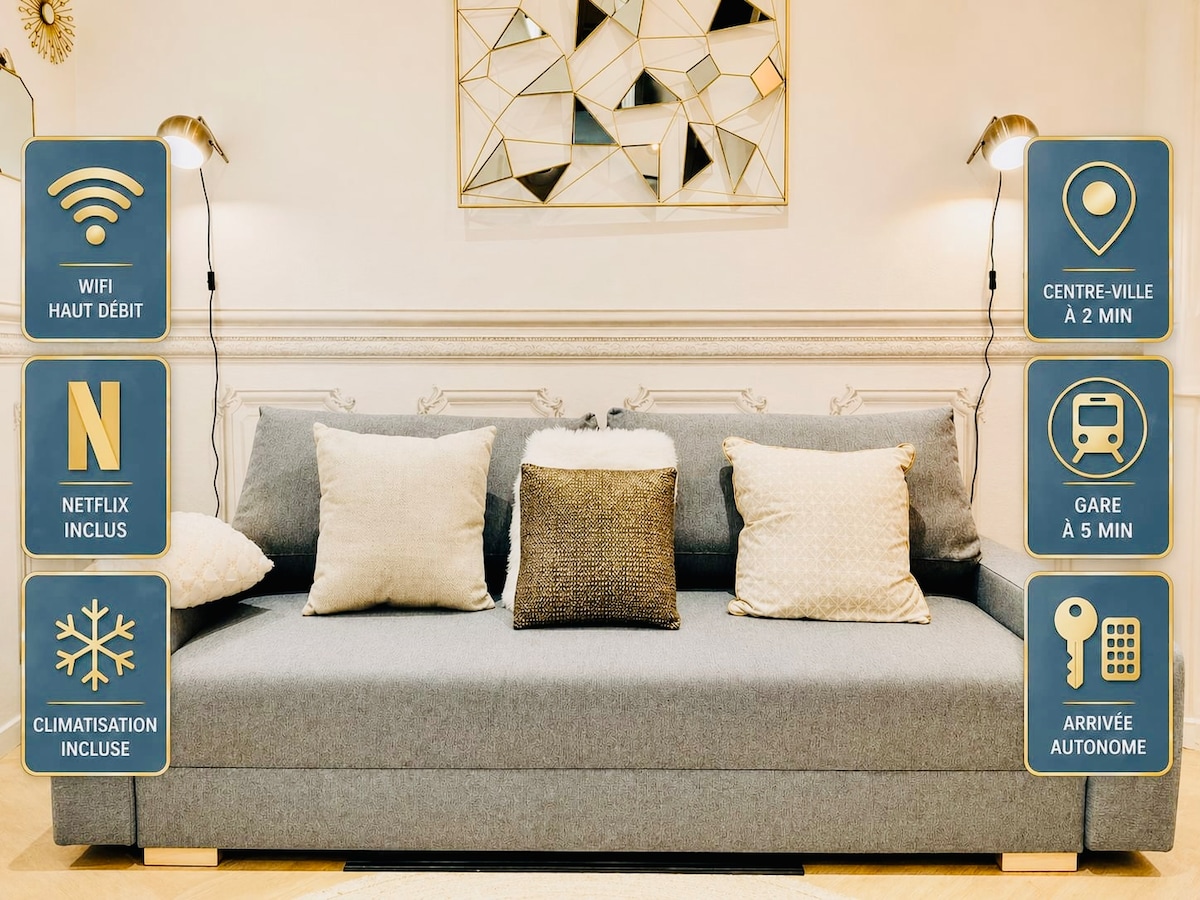 ✨ SCHICKES INDUSTRIE-LOFT - PLACE GARIBALDI Ruhiges Designerjuwel mit Blick auf einen ruhigen Innenhof (Ziegel, Balken, Glaswand). • ERDGESCHOSS: Wohnzimmer mit Klimaanlage (Fernseher, Schlafsofa). Voll ausgestattete Küche (Nespresso, Geschirrspüler, Waschmaschine). Schlafzimmer (140 x 200 Bett) & Verdunkelungsvorhänge. Modernes Bad (begehbare Dusche). • Zwischengeschoss: 140 x 200 Bett über Designertreppe. 📍 BESTE LAGE: 2 Min. Altstadt, 5 Min. Hafen. Straßenbahn 1 & 2 in 1 Min. Perfekte Mischung aus Stadtleben und Ruhe.