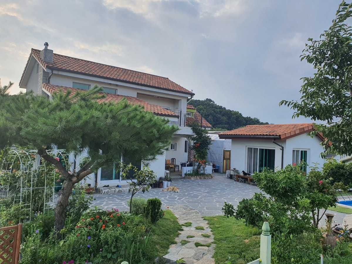 Herzlich willkommen!! Unsere Unterkunft ist ein Einfamilienhaus mit Waldblick vor dem Fenster, und der Klang der Vögel am Morgen und am Abend, und die saubere Luft und die Privatsphäre stechen hervor. Es ist ein 25-Pyeong-Gebäude im ersten Stock (separater Eingang, Selbst-Check-in). Der zweite Stock ist ein Familienzimmer. - Keine Haustiere erlaubt - Der Grillplatz für das Paarzimmer kann auch bei Regenwetter genutzt werden ☆ Grillgebühr von 30.000 KRW (Grill, Holzkohle, 2 Roste, Holzkohlefeuerstarter, Fackel, Gasbrenner, Butangas) wird bereitgestellt Kostenloser ☆Elektrogrill (am Grill) - Die Standardanzahl der Personen beträgt 2 Personen, und es fallen zusätzliche Kosten von 35.000 Won pro Person (0 Jahre ~ Erwachsener) für bis zu 3 Personen an. Die zusätzlichen Kosten für Kleinkinder sind gleich (2 Personen bieten 1 Queensize-Bett, 3 Personen bieten 1 Queensize-Bett und 1 Einzelset) - Aufgrund der Art der Unterkunft befindet sich direkt davor ein Wald mit Bäumen Es kann Fehler geben.