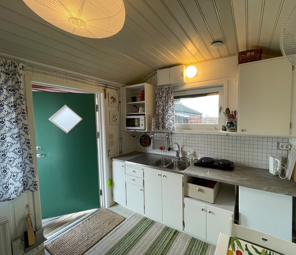 Willkommen in Gästehäusern in Mjörn. Perfekte Lage am See für diejenigen, die die Nähe zur Natur, Angeln, Schwimmen, Ruhe, Pickpilz und Beeren, Schlittschuhe/Skier am gefrorenen See mögen. Das Haus ist auf unserem Grundstück, kostenlose Parkplätze und WLAN. Das Haus ist klein, enthält aber alles, was du brauchst, eine kleine Küche mit Kühlschrank, zwei Herdplatten, Warm-/Kaltwasser und Etagenbett. Modernes, neu gebautes Badezimmer. Es gibt Zugang zu Grill und Ruderboot mit Angelausrüstung und Schwimmwesten. Mit dem Auto nach Göteborg dauert es 45 Autominuten nach Göteborg.