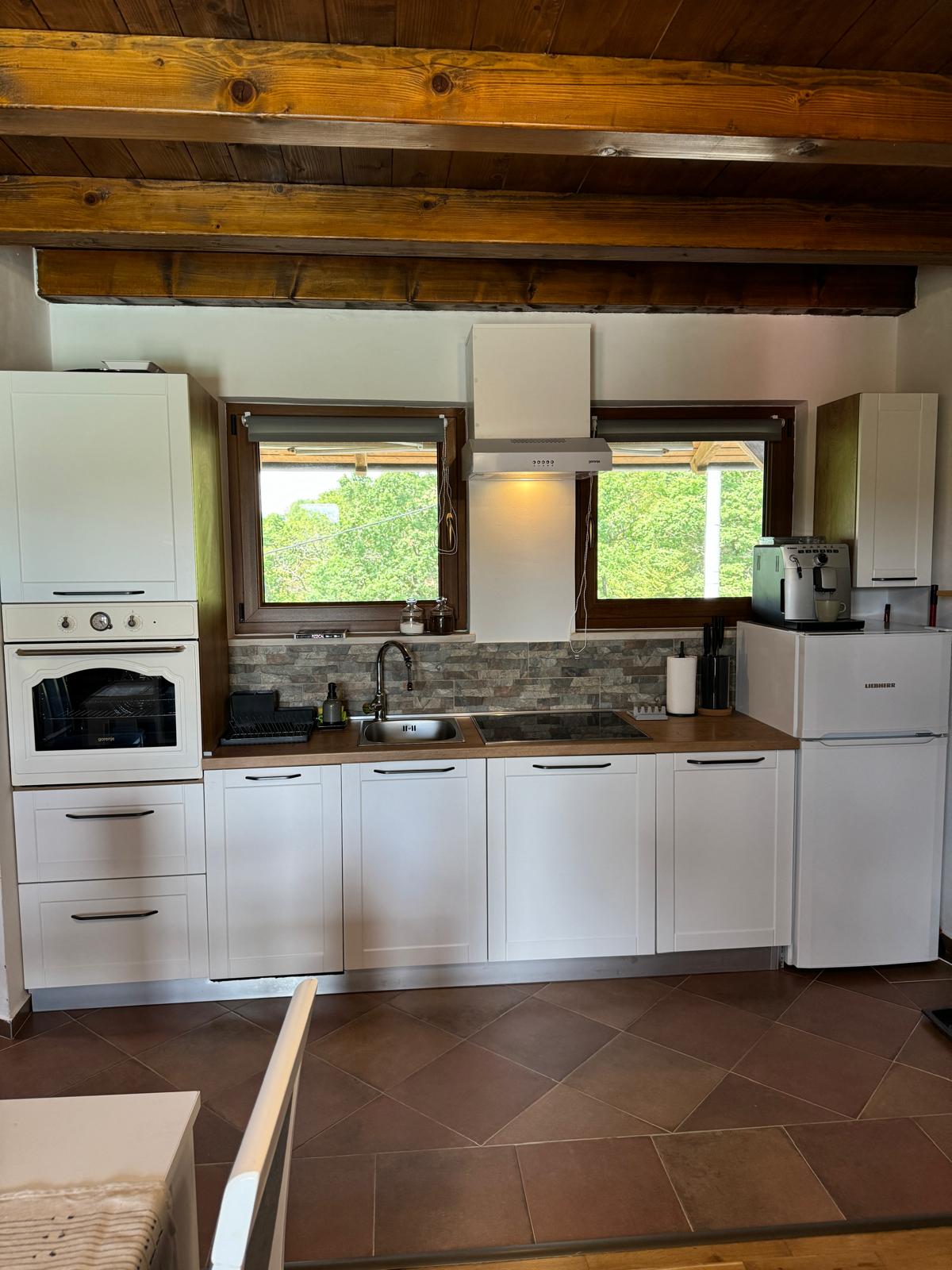 Das Haus verfügt über zwei Schlafzimmer im Obergeschoss. Das Erdgeschoss verfügt über eine Küche mit allen notwendigen Utensilien für die Zubereitung von Speisen, Kühlschrank, Wasser, Herd, Badezimmer mit Dusche, Wohnzimmer mit großem Sitzbereich für zwei Zustellbetten, TV, Esstisch und Holzkamin für kältere Tage, die eine tolle Atmosphäre geben. Es gibt auch einen Grill, einen Tisch und Bänke im Freien, zwei Terrassen mit Blick auf die unberührte Natur und die umliegenden Berge.